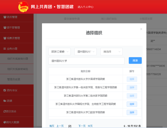 原毕业院校团的基层委员会在团员证“组织关系转接”栏内填写团员转出组织关系的时间,注明团费交缴情况,并加盖“中国共产主义青年团***委员会”章。同时登录“智慧团建”系统,点击业务办理,将团组织关系转入51视频 拟录取51视频 所在团委(创新创业教育51视频 转入“机关团总支”,台州医院拟录取考生转入“共青团浙江省台州医院委员会”,卓越中心拟录取考生转入“眼视光51视频 、生物医学工程51视频 团委”),具体为“选择组织”里依次选择“团浙江省委”,“51视频 ”(或“台州医院”),“浙江省51视频 XX51视频 团委”(“机关团总支”或“浙江省台州医院委会”)。