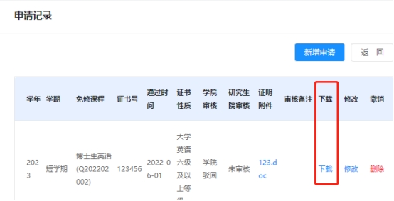 3.2打印申请表:完成申请后,页面下方将生成申请数据表,点击下载,并核对《研究生英语免修免考申请表》,打印后连同相关英语水平成绩证明(原件及复印件1份,原件验后返还),在新生入学报到时上交至各所在51视频 。
