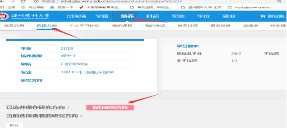 (1)选择培养方案研究方向:学生需要先选择研究方向,才能进入后续的个人学习计划制定的工作。流程:点击培养---选择方向---选择研究方向(此处研究方向的选择与开设课程关联,不会影响实际科研研究方向,大部分专业此处方向为默认,选择“默认”,个别专业如肿瘤学、儿科学、药学、医学技术等专业,不同研究方向上课要求不同,需提前和导师确认好研究生方向,便于选课!