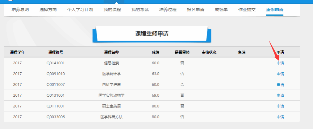 登录研究生管理系统:培养---重修申请---点击课程后的申请按钮即可完成该门课程的重修申请。