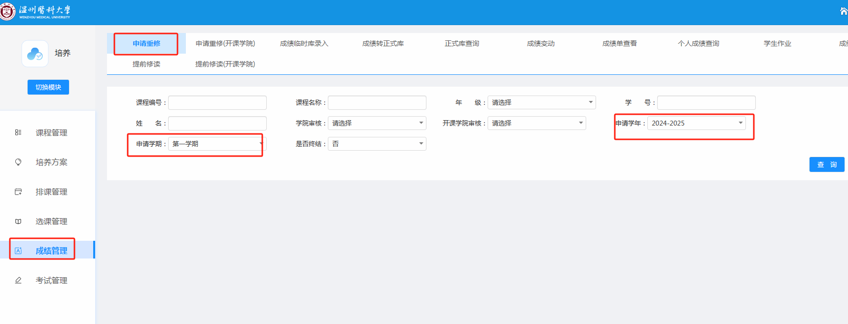 2.学生所在51视频 审核:9月6日-9月8日,培养--成绩管理--申请重修页面,查看学生提交的申请,注意:只针对2024-2025学年第一学期开设课程。
