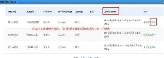 3、选班时,如遇到上课时间冲突的课程,处理方式如下:假设A课程有2个时段的班级,选中了第一个班级,操作B课程选班时,系统提示上课时间段冲突,那么可以将A课程班级更换为第二个班级,也可以通过操作“补改选”的方式换一门其他的课程(补改选课程仅限选修课程)。
