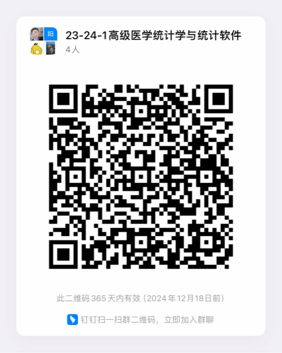 由于课程冲突难以调课,1月1日(周一)13:30-16:25《高级医学统计学与统计软件》由毛广运老师授课,授课内容为协方差分析、主成分分析、因子分析。上课由线下改为钉钉群线上直播,请茶山1班同学(上课名单详见附件)通过扫二维码加入钉钉群“23-24-1高级医学统计学与统计软件”。
