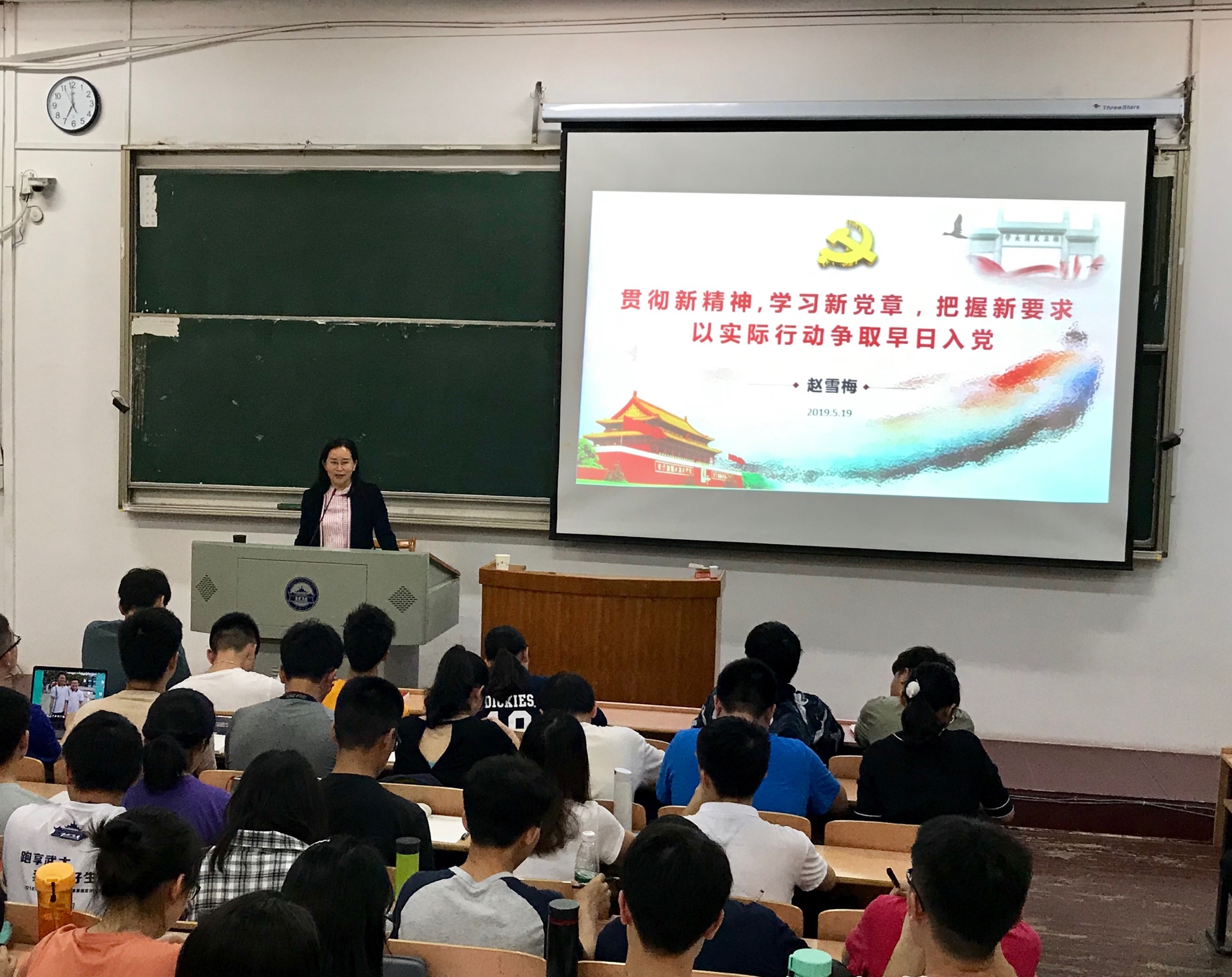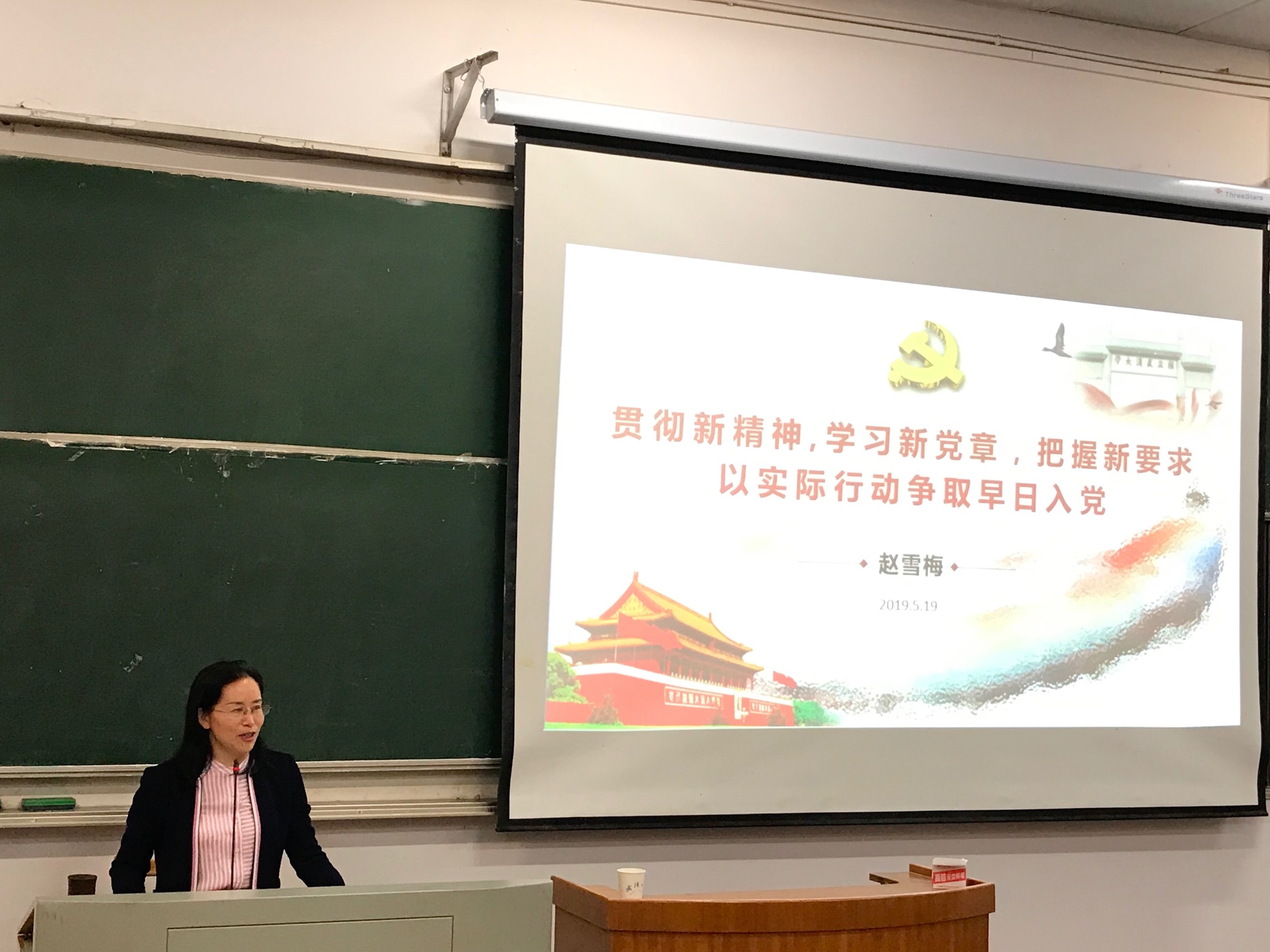 随后,赵书记带领大家回顾了党章的发展历程和主要内容。赵书记主要从党章的地位和作用,党章的发展历程,十九大对党章修订的主要内容,现行党章的主要内容等方面进行讲解。她通过丰富的历史故事与大量的鲜活案例,为我们生动地呈现了一幅中国共产党的发展历程图。她希望培训班的同学们要坚定对马克思主义的信仰,要坚定对中国特色社会主义理论的信念,要坚定对实现伟大复兴的中国梦的信心。
