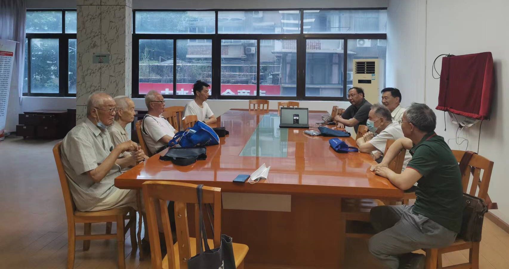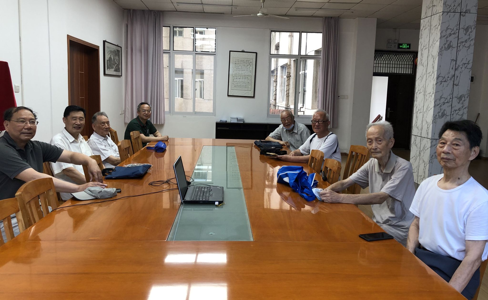 开播时间是下午4:00点,3:30支部在校的8位党员同志就来到了会议室。已是90岁高龄的戴国瑞教授、李钰心教授,拄着拐杖,蹒跚上楼,“年轻”党员看到,赶紧上前搀扶;雒文生教授刚刚病愈就来参加学习,他说“这点病那能耽误党课学习呀”。