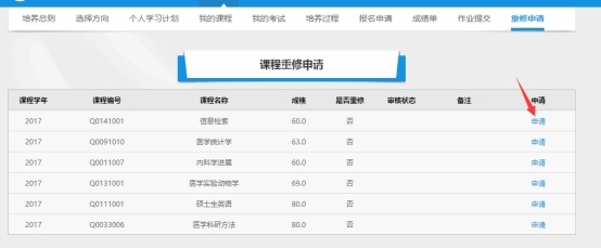 各位同学在6月4日--6月6日登录研究生管理系统:培养---重修申请---点击课程后的申请按钮即可完成该门课程的重修申请。
