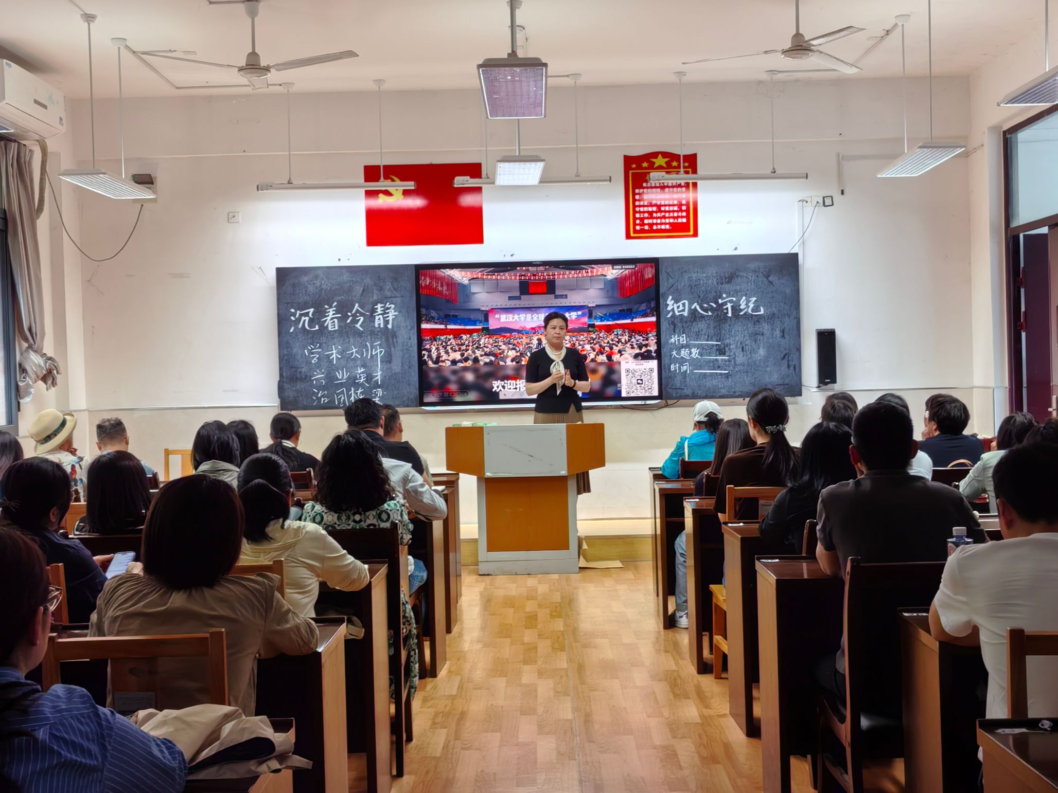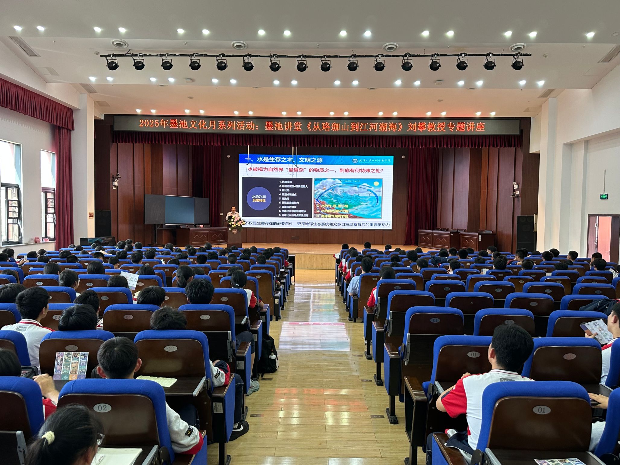 在学术报告厅,刘攀以《从珞珈山到江河湖海》为题作专题科普讲座。他从水科学的起源切入,介绍了水安全问题的重要性。同时,他围绕水利拔尖人才培养,介绍了学院的学科实力、师资队伍和人才培养质量,并详细阐释学院新设立的碳中和本硕博试验班、智慧水利本硕试验班的培养目标与特色优势。