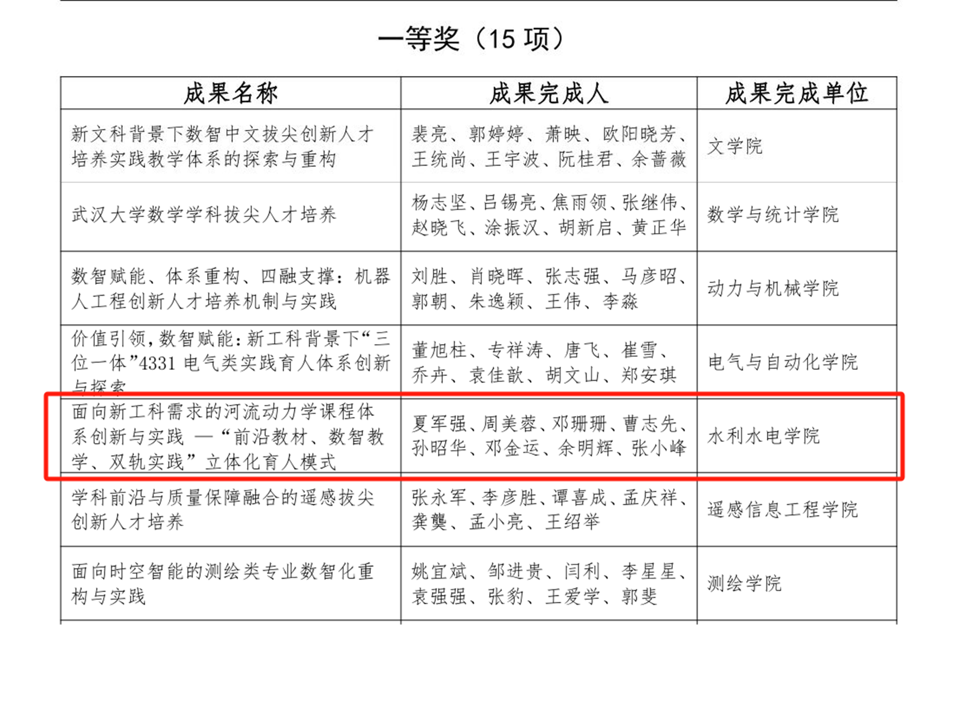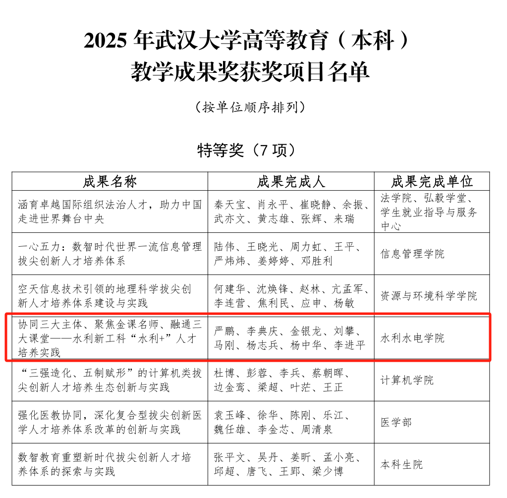 高等教育(本科)教学成果奖揭晓41项教学成果奖,学院2项成果获奖。严鹏教授牵头的“协同三大主体、聚焦金课名师、融通三大课堂——水利新工科‘水利+’人才培养实践”获特等奖,夏军强教授牵头的“面向新工科需求的河流动力学课程体系创新与实践一‘前沿教材、数智教学、双轨实践’立体化育人模式”获一等奖。