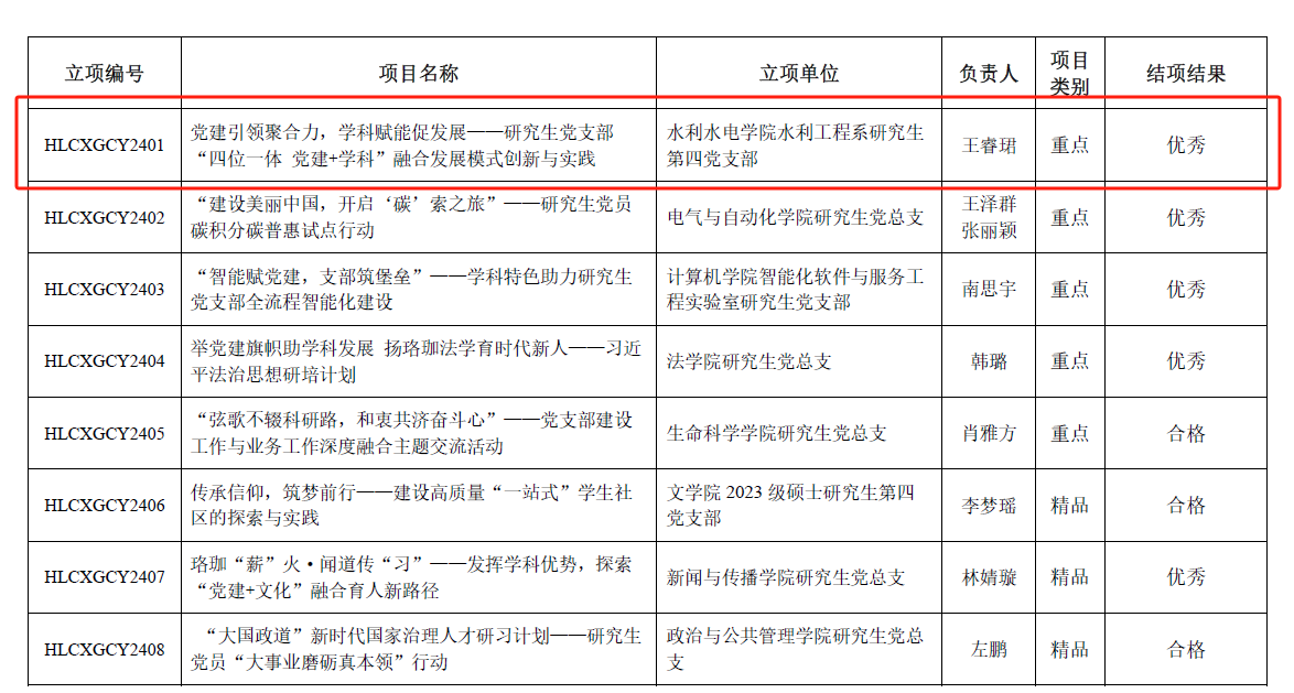 近日,学校党委组织部、党委学生工作部和党委研究生工作部发布了《关于公布2024年学生党支部“活力创新工程”立项项目结项评审结果的通知》。经前期立项、活动举办和后期评审,学院两个研究生党建项目顺利通过验收,其中由水利工程系研究生第四党支部申报的重点项目(全校仅五项)获评“优秀”。