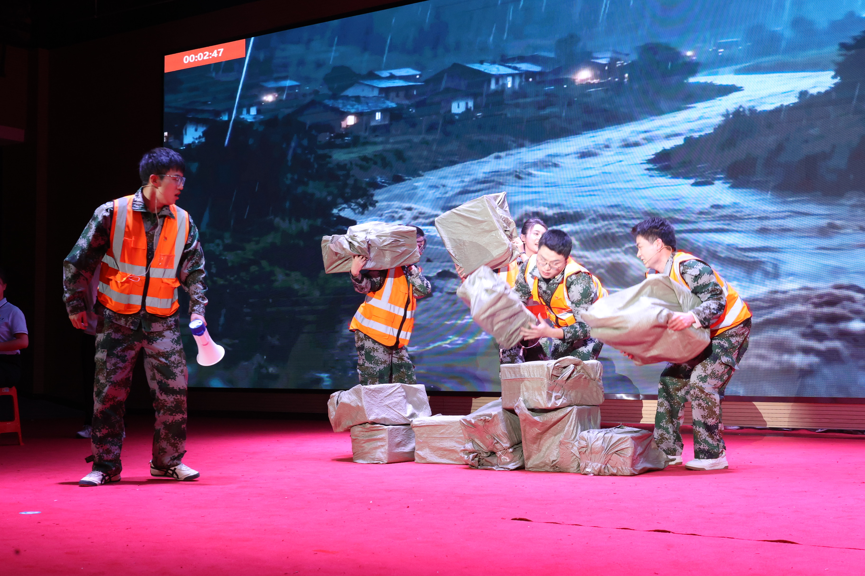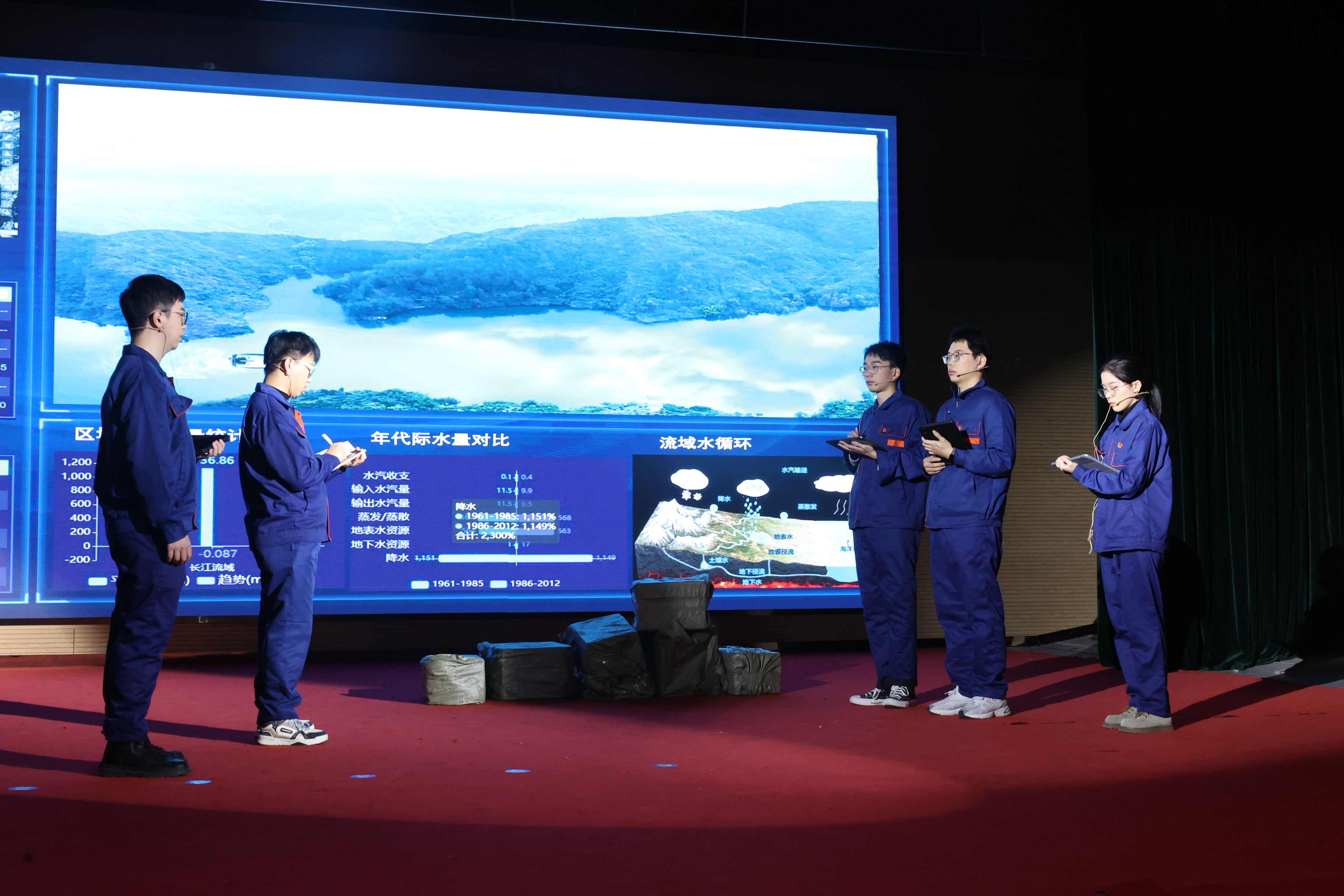 在决赛现场,水文与水资源系研究生第一党支部创作并演绎了原创情景剧《洪水的答卷》。该剧以一堂党课为主线,通过时空交叠的叙事手法,生动展现从1998年抗洪前线“人在堤在”的英勇坚守,到新时代依托卫星监测、无人机巡查与智能预警系统的智慧防汛实践。剧中不同年代的青年跨越时空对话,彰显了抗洪精神从“血肉长城”到“科技防线”的传承与演进,表达了新时代水利青年胸怀“国之大者”、以过硬本领守护江河安澜的坚定信念。