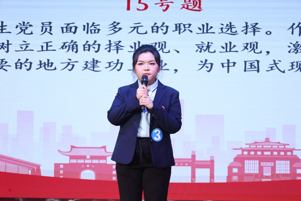 在决赛实操问答环节,水文与水资源系研究生第一党支部书记、2025级博士研究生蒋欣一围绕“如何引导研究生党员树立正确择业观、就业观”这一问题展开阐述。她以“把论文写在祖国大地上”为主线,结合支部建设与专业特色,提出了一系列逻辑清晰、立足实际的观点与对策,充分展现出学院学生党员过硬的政治素养、扎实的理论功底与鲜明的模范带头作用。