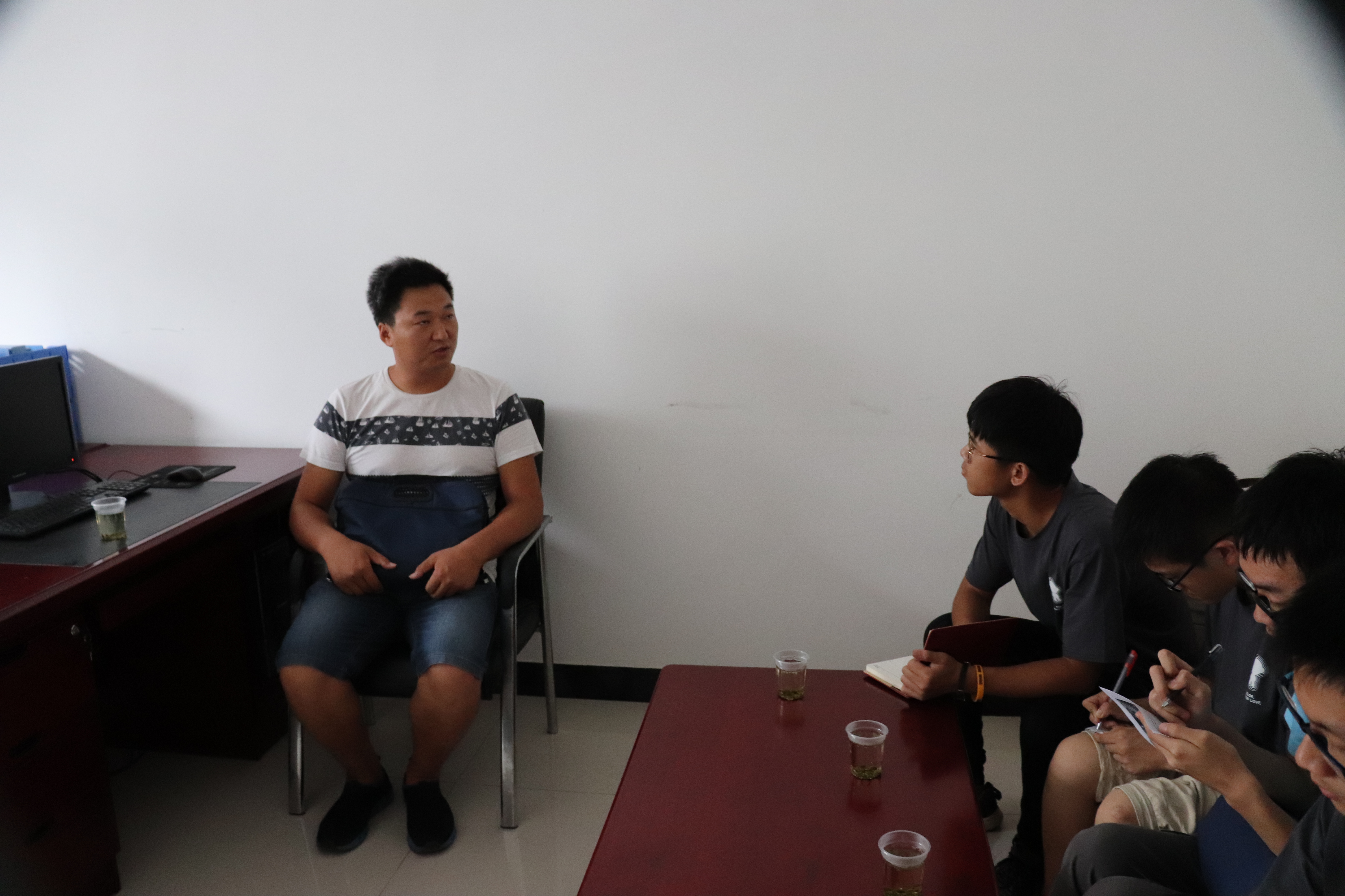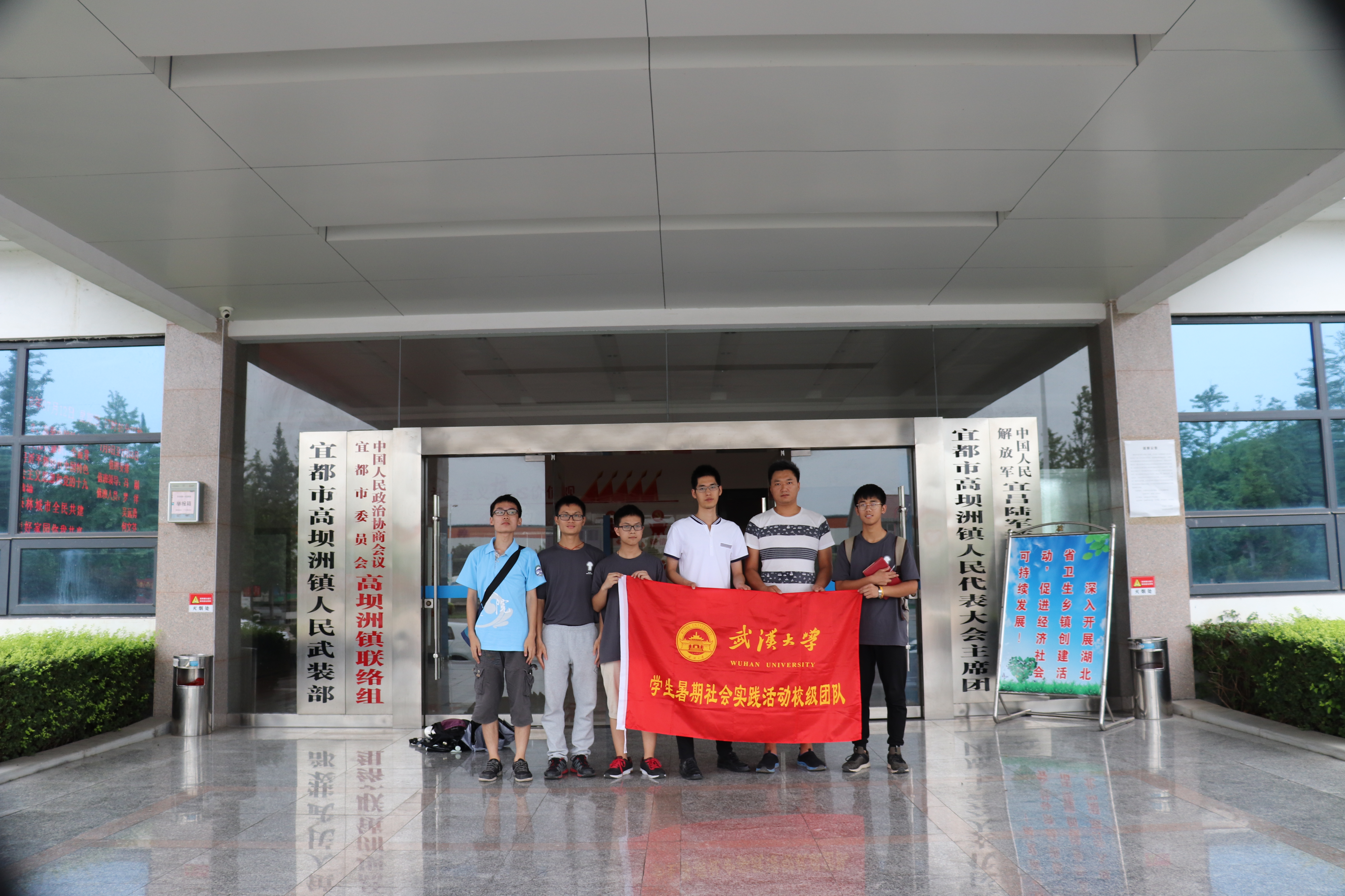 的同学们来到了高坝洲镇人民政府。据了解,由于负责当地河长制推行的副镇长外出参加会议,政府人员特地为实践队请来了当地水利局的工作人员。在长达一个小时的座谈中,队员们与专业人士就高坝洲镇河长制的推行情况,如今面临的主要问题以及后期的解决措施展开谈话,并关于如何开展“河长制”进校园话题彼此交换了意见。实践队员从工作人员铿锵有力的话语与坚定的眼神中感受到了政府对于河长制推行力度之大、决心之大。工作人员向实践队的同学介绍道,“河长制湖长制的推行有利于长江岸线生态复绿,对于我们高坝洲镇来说,就是必须做好长江堤岸与清江堤岸的生态保护”。随后,他又补充道“在本地河长制的落实工作中,竖立河湖长公示牌、设立河流巡管员、组织干部沿河道巡查,从市委书记到各村村民委员会主任,全市各级干部都严阵以待,我们坚决要为老百姓打好这场碧水保卫战。”
