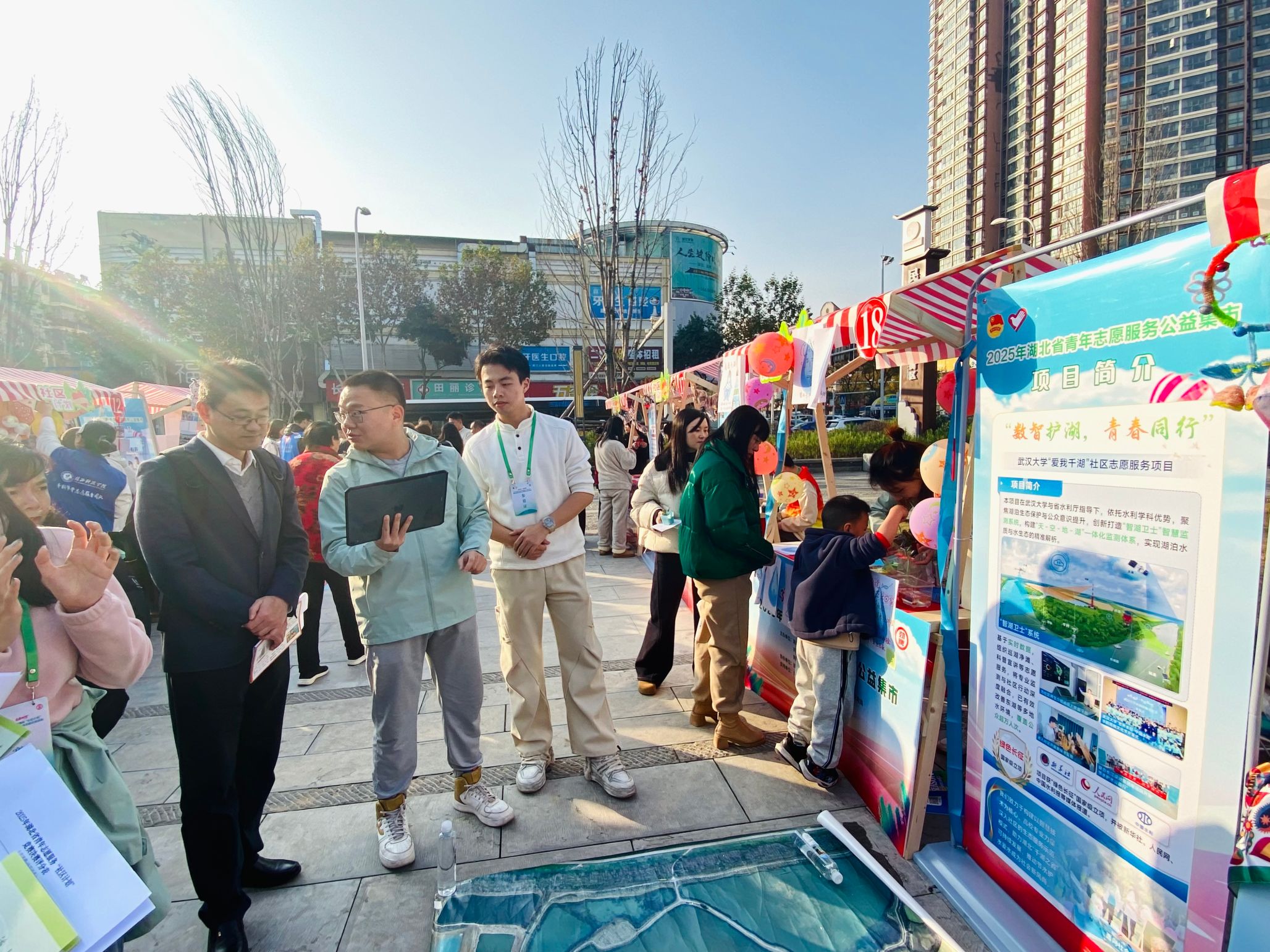 荆门市民主街历史文化街区的公益集市热闹非凡。在服务队精心布置的展位前,市民络绎不绝,三大互动板块吸引了众多参与者的目光。小朋友们手持空白水滴卡片,用画笔为“水滴”赋予生命与色彩,在自由涂鸦中感受水资源的珍贵。一旁的“水质监测小船”体验区内,人们亲手折叠简易小船,并认真写下“节水护湖,从我做起”等宣传标语,将环保理念融入动手实践中。与此同时,志愿者通过“智湖卫士”系统的现场演示,让市民近距离感受到科技如何为水环境保护提供智慧支持。