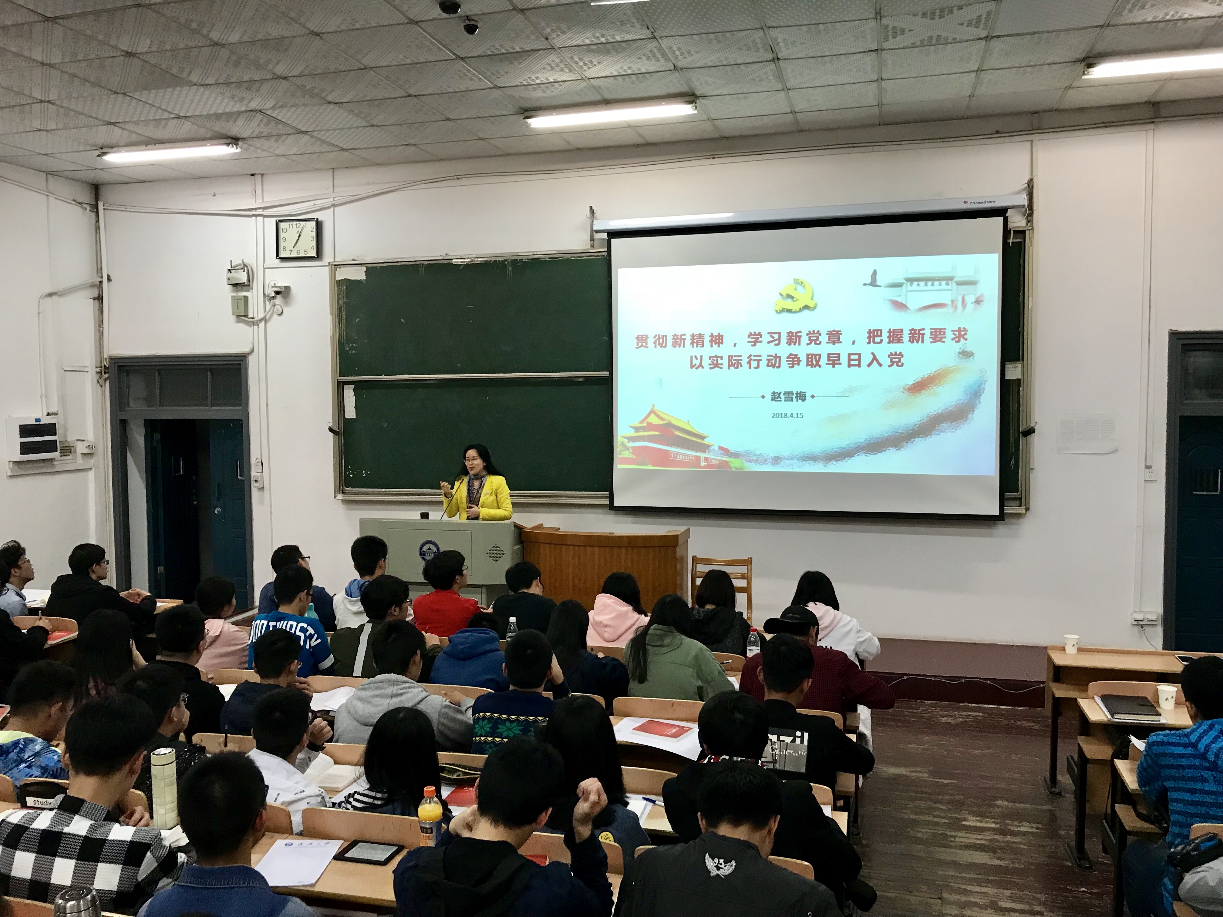 党委副书记赵雪梅教授为本期入党积极分子们上了一堂以《贯彻新精神,学习新党章,把握新要求 以实际行动争取早日入党》为题的精彩党课。赵书记首先以学习贯彻党的十九大精神入手,为我们介绍了大会的概况和主要成果,并讲解了十九大报告的主要精神和亮点,让我们了解到十九大在政治、理论,实践等各个方面的创新突破和巨大成就。赵书记指出,十九大报告确立了习近平新时代中国特色社会主义思想的历史地位,“八个明确”不仅是党和人民实践经验和集体智慧的结晶,更是全党全国人民为实现中华民族伟大复兴而奋斗的行动指南。之后,赵书记带领同学们牢记了新时代坚持和发展中国特色社会主义基本方略,即“十四个坚持”,她通过对“十四个坚持”之间内在联系的讲解,让同学们能够更加快速且牢固地对所讲内容进行学习和记忆。