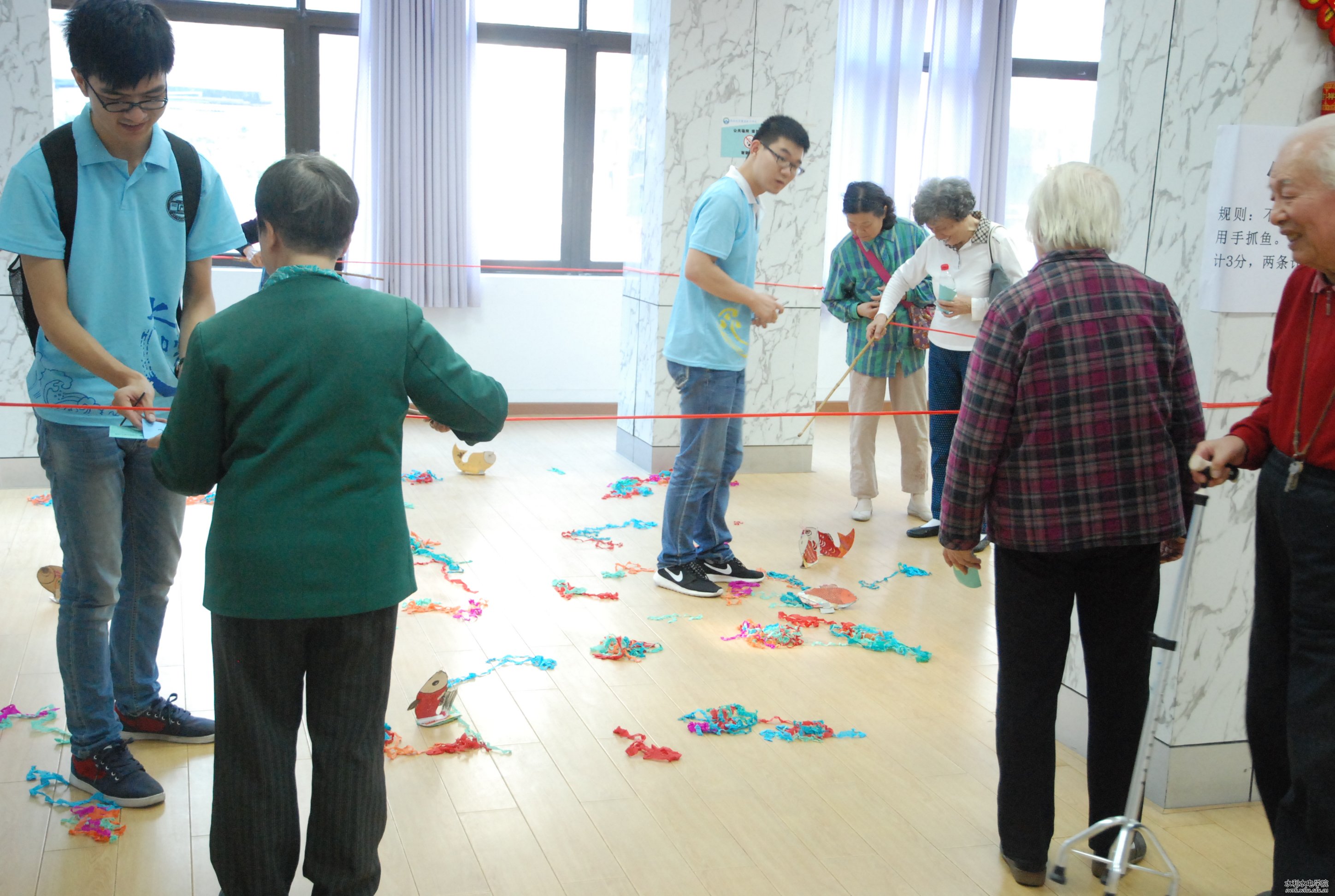 随后,老同志们全情投入到学院精心策划的联谊会中。活动包括投篮、套圈、猜谜语、摸鼻子、小猫钓鱼、吹乒乓球等多个趣味项目。为了方便老教师参与活动,身着“水院蓝”的学生志愿者耐心地为老教师们认真讲解游戏规则,并做好示范。整场活动充满欢声笑语。