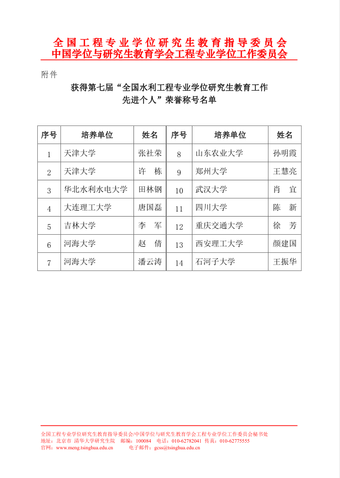 根据全国工程专业学位研究生教育指导委员会中国学位与研究生教育学会工程专业学位工作委员会 [2019]8-11号文件,经个人申请、 单位推荐、领域核心组成员和专家投票、教指委审定,我院3名教师和1名研究生获得表彰。