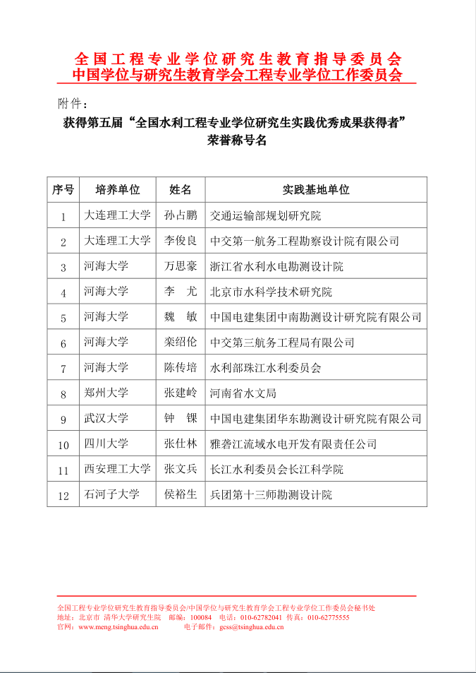 文件公布了18名 “全国水利工程专业学位研究生优秀指导教师”、14名“全国水利工程专业学位研究生教育先进个人”和12名“全国水利工程专业学位研究生实践优秀成果获得者”,其中我院共4名师生受到了表彰。伍靖伟、刘全2位老师荣获第三届“全国水利工程专业学位研究生优秀指导教师”;肖宜老师荣获第七届“全国水利工程专业学位研究生教育先进个人”;管光华老师指导的2017级专业学位硕士研究生钟稞同学荣获第四届“全国水利工程专业学位研究生实践优秀成果获得者”称号。