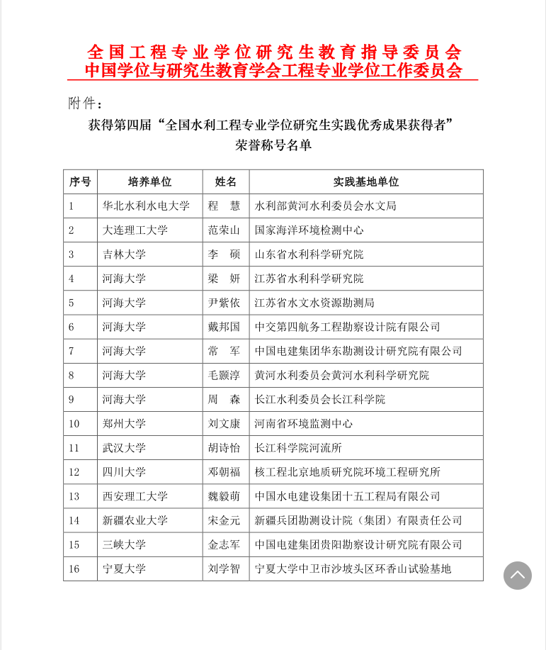文件公布了16名 “全国水利工程专业学位研究生优秀指导教师”、20名“全国水利工程专业学位研究生教育先进个人”和16名“全国水利工程专业学位研究生实践优秀成果获得者”,其中我院共6名师生受到了表彰。杨国录、程永光和管光华3位老师荣获第二届“全国水利工程专业学位研究生优秀指导教师”;陈森林和王均星老师荣获第六届“全国水利工程专业学位研究生教育先进个人”;2016级专业学位硕士研究生胡诗怡同学荣获第四届“全国水利工程专业学位研究生实践优秀成果获得者”称号。