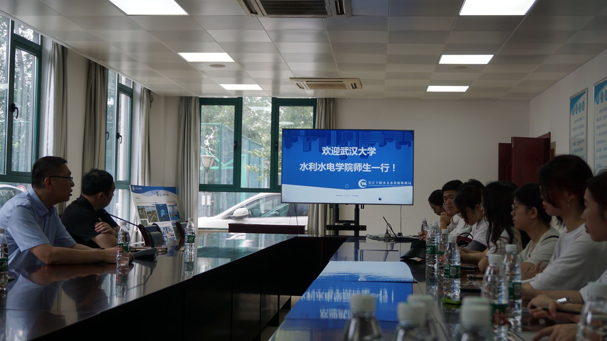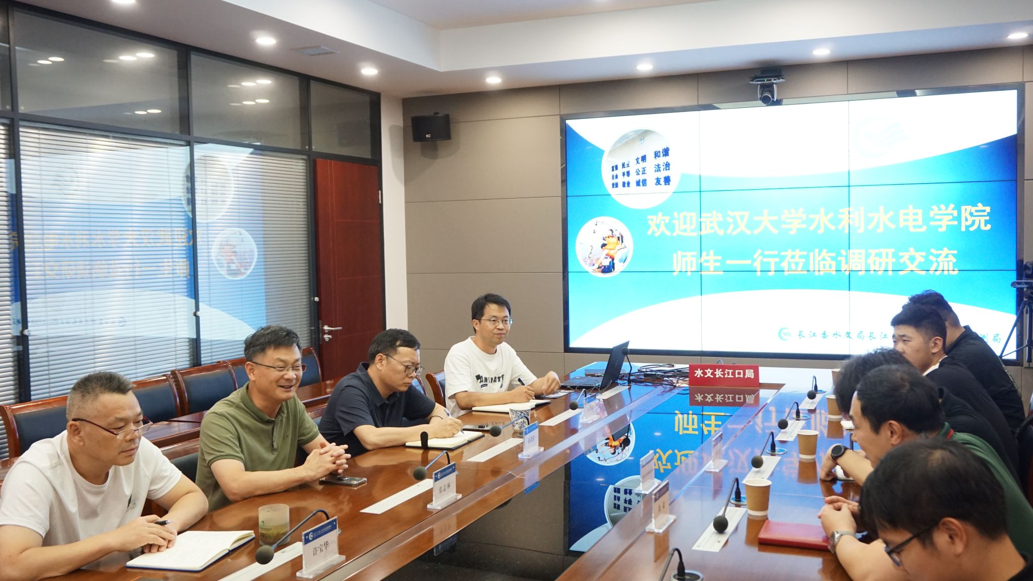 随后,实践队与长江下游水文水资源勘测局举行了交流座谈会。会上,下游局的领导们对实践队的到来表示欢迎,并从单位基本情况、主要工作任务、科研技术服务及单位文化建设等八个方面进行了详实的介绍。实践队介绍了团队的基本情况、2022年暑期在长江黄河中上游六省九市所开展的工作及成果。结合专业所学内容和实地走访情况,实践队队员们提出诸多问题,包括下游局的生态治理措施、专业就业问题、水利前沿问题,长江下游近10年的生态建设成果等,下游局的领导们也耐心细致地为同学们进行了解答。