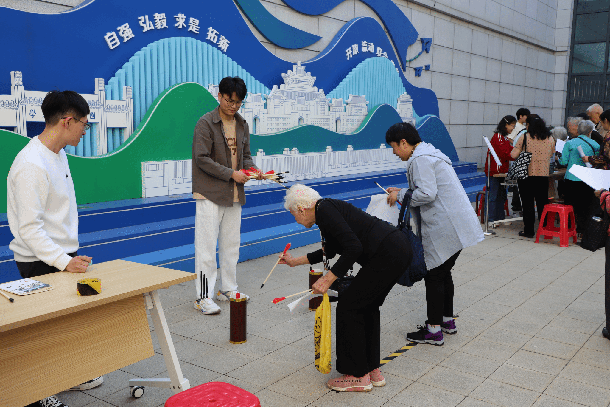大会结束后,在学院青协和研究生志愿者同学们帮助和指引下,老同志们开展了重阳节游园活动。游园会设置了猜谜语、贴鼻子、五子棋、投壶等9项趣味活动。现场气氛热烈、暖意浓浓。看到老同志们有说有笑的参加活动,刘金才表示,这样的活动非常好,很适合老同志们,既加深了学院与老同志们的连接,也加强了老同志们之间的交流与联系,希望学院把这项传统活动保持下去。