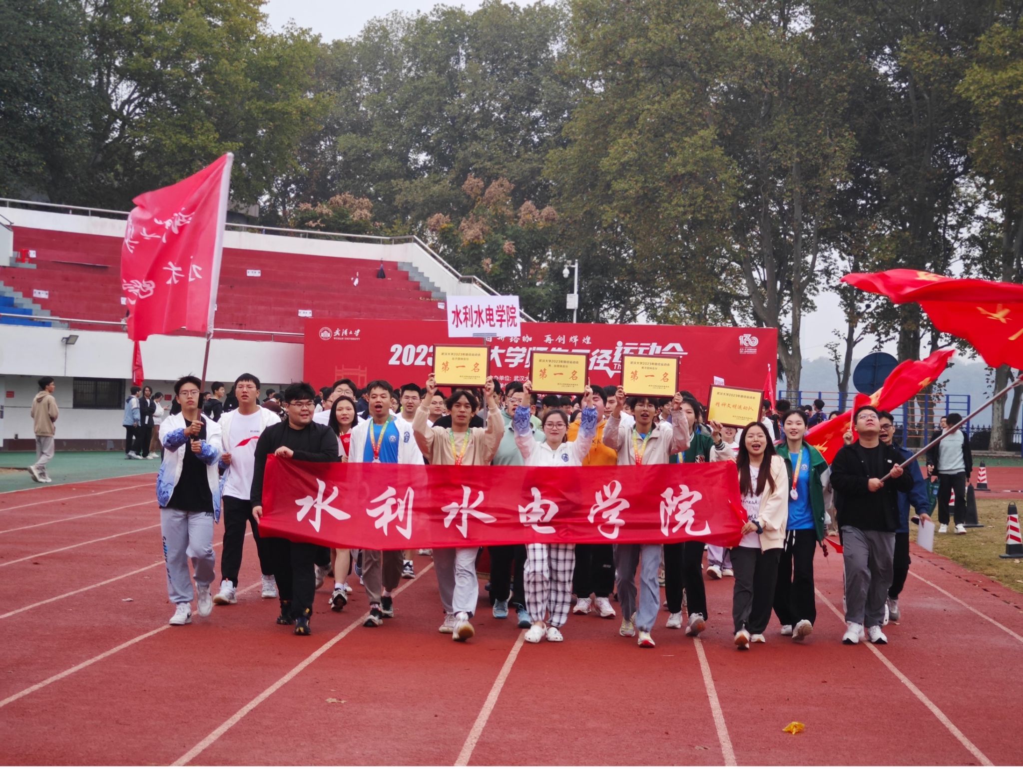 2023年师生田径运动会在工学部松园操场顺利举行,水院学子团结协作,成功卫冕冠军,再次荣获男子团体总分第一名、女子团体总分第一名、男女团体总分第一名,并获体育精神文明奖,实现校运会19年12冠。