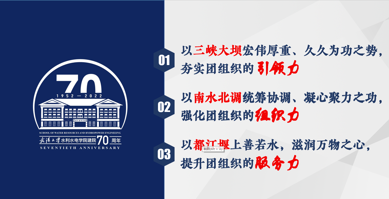 答辩环节中,我院团委将三项著名大型水利工程的精神特质与团组织的三力协同的内涵巧妙融合。通过“以三峡大坝宏伟厚重、久久为功之势,夯实团组织的引领力”、“以南水北调统筹协调、凝心聚力之功,强化团组织的组织力”、“以都江堰上善若水、滋润万物之心,提升团组织的服务力”三个板块,围绕思想引领、基层团建、团学改革、学风建设、品牌活动等方面展示了学院团委过去一年取得的工作成绩,最终获得现场评委和观众的一致好评。