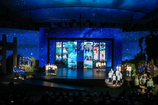 《大道薪传》则以音诗画的表演形式描摹了百卅武大走过的道路,薪火相传、笃行大道。其中,学院学子们通过情景展示描绘了同学们坚定理想信念、“守卫一片绿水,谱写双碳新篇”的生动画卷,展现了学院深入学习贯彻习近平总书记重要讲话精神,积极贯彻新发展理念,立足水资源,做活水文章,将生态文明理念贯穿水利学科建设,聚焦双碳战略目标,协同推动水资源绿色低碳循环与生态环境高水平保护,打造世界一流水利学科,培养一流水利人才,精准服务国家战略需求的发展现状。