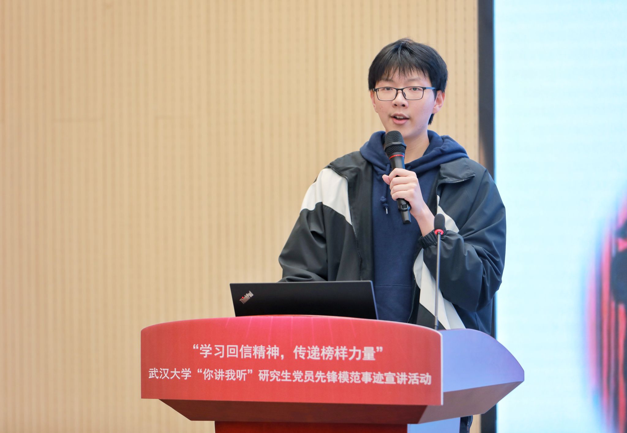 以学习回信精神为主题,陈亮宇同学讲述了武大师生四十载坚持南北极科学考察的历程,分享了中国第39次南极科学考察的故事,带领大家共同感受一段不平凡的旅程,学习不畏艰险、勇往直前的南极精神。