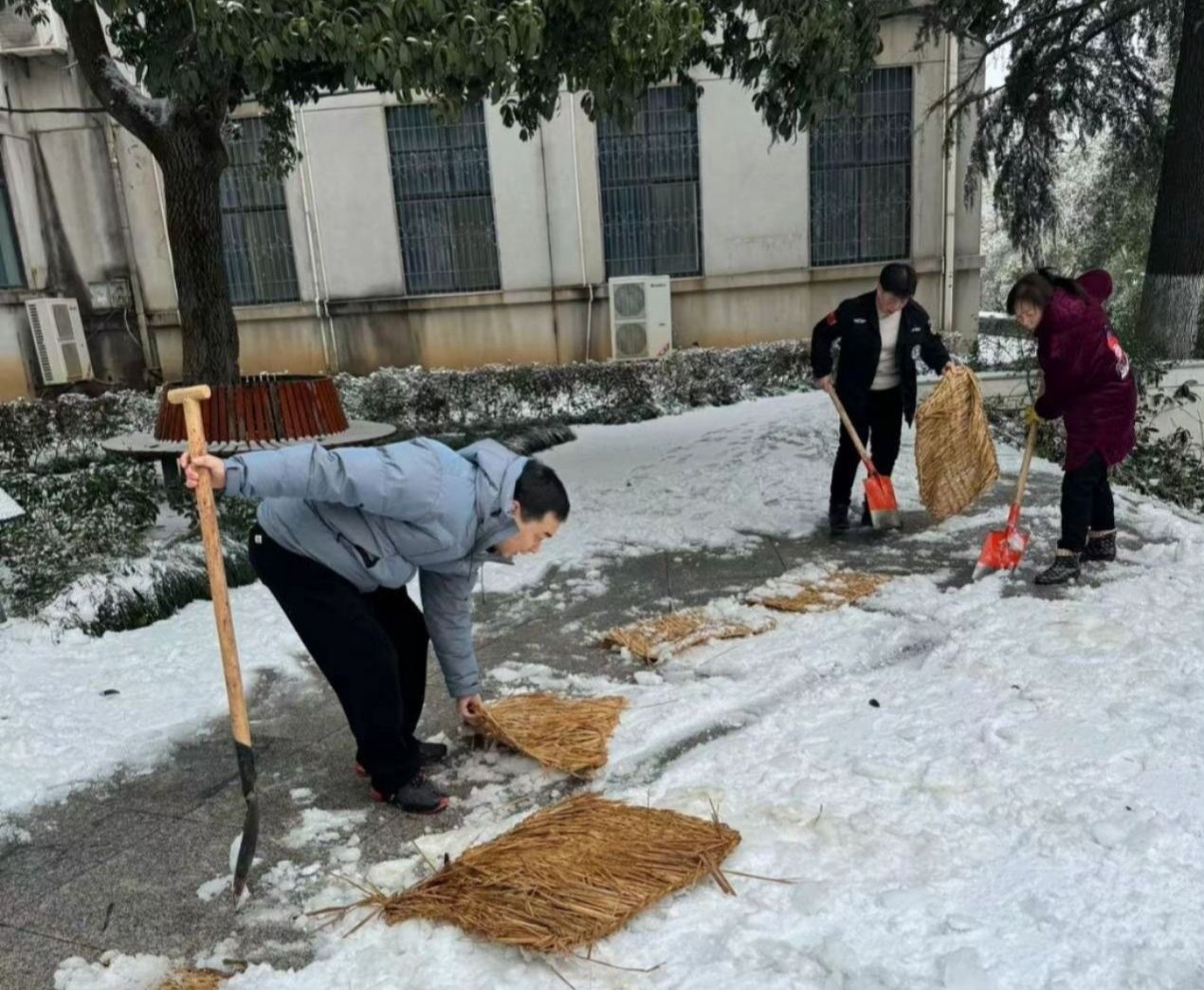 此外,为保障学院周边道路畅通,近日来学院及时安排人员不间断巡查周边道路积雪和结冰情况,及时清理地面积雪,草编麻袋铺成道路,将“防滑通道”延伸至办公楼门口;密切关注积雪和树木倒落情况,及时上报处理安全隐患,并在高风险地区设置警戒线。