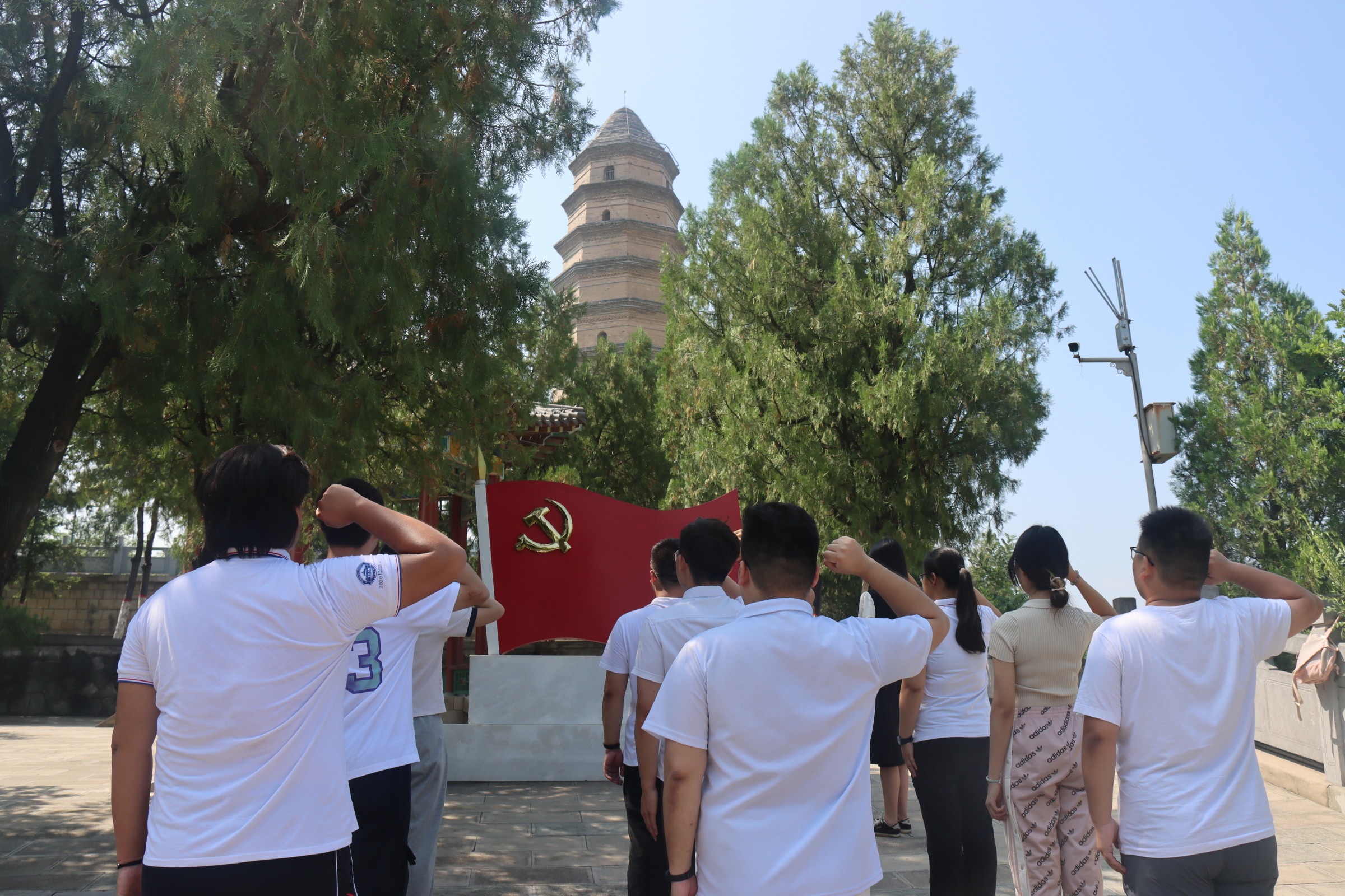 7月4日上午9点,实践队全体党员同志自发前往宝塔山,回溯峥嵘岁月,感悟红色情怀。“延安有宝塔,巍巍高山上”,党中央和毛主席曾在延安奋斗了十三个春秋,留下了优良传统和作风。这座古塔见证了中国革命实现历史性转折、走向胜利的光辉历程。进入园区后,同志们首先瞻仰宝塔风貌,接着在刘国为同志的领誓下,全体党员面向党旗举起右拳,重温入党誓词。