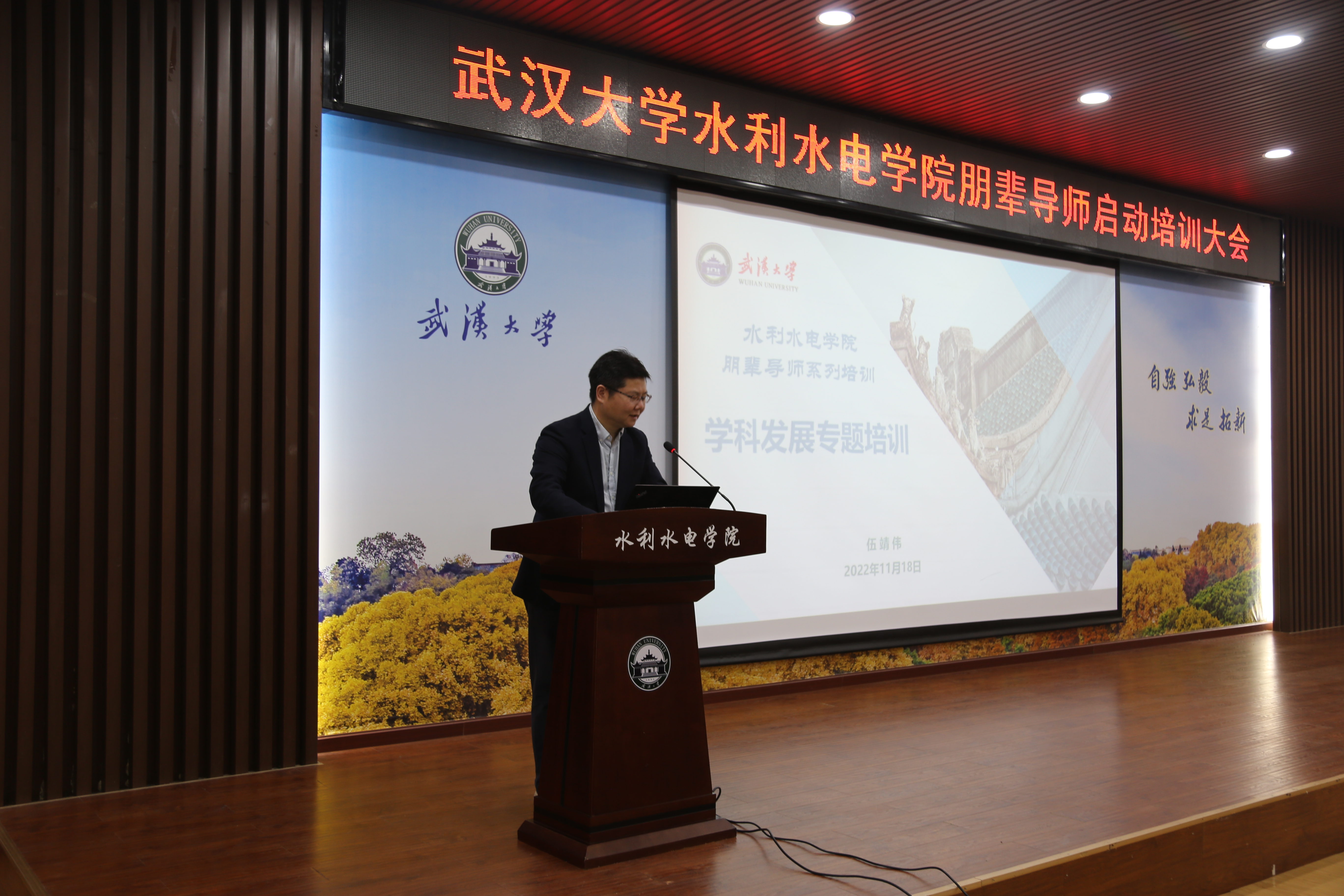 伍靖伟作“学科发展”专题培训,从什么是学科展开,介绍了我院历史悠久、实力雄厚、特点突出的水利学科,并展示了近年来学院的代表性学术成果,对学科未来的发展前景作出生动解读。