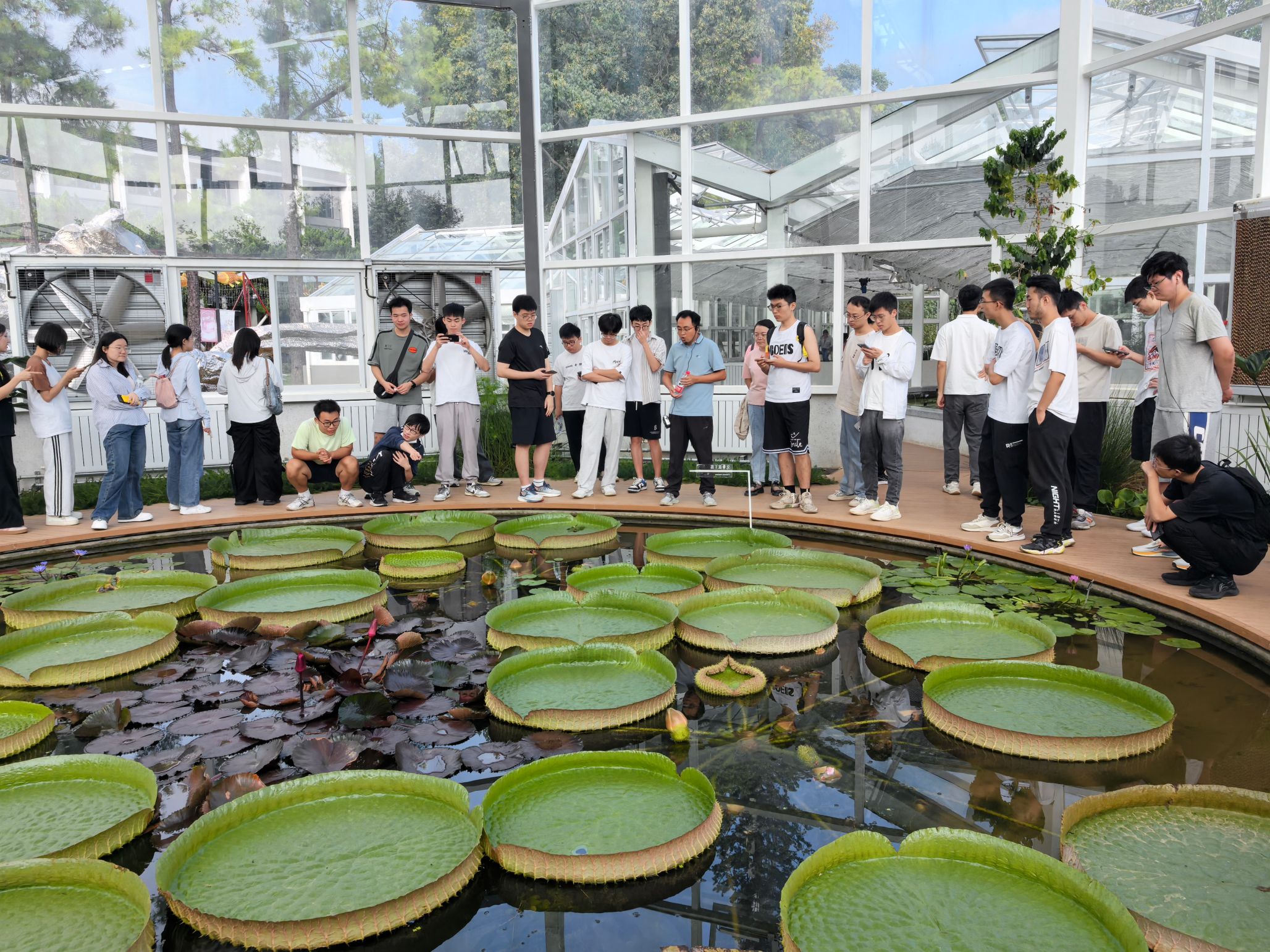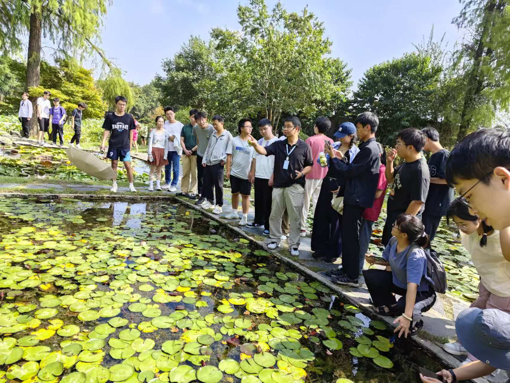 在中科院武汉植物园磨山园区,王伟、操瑜、潘俊峰三位老师为学生深入讲解了水生植物辨识、三峡水库消落带植被变化模拟实验及农业面源污染防控实验概况,通过这些实践内容,学生们近距离观察水生植物形态和特征、探讨水陆过渡带植被动态变化规律、熟悉农业面源污染来源与治理技术,从而加深对水生态系统的理解。