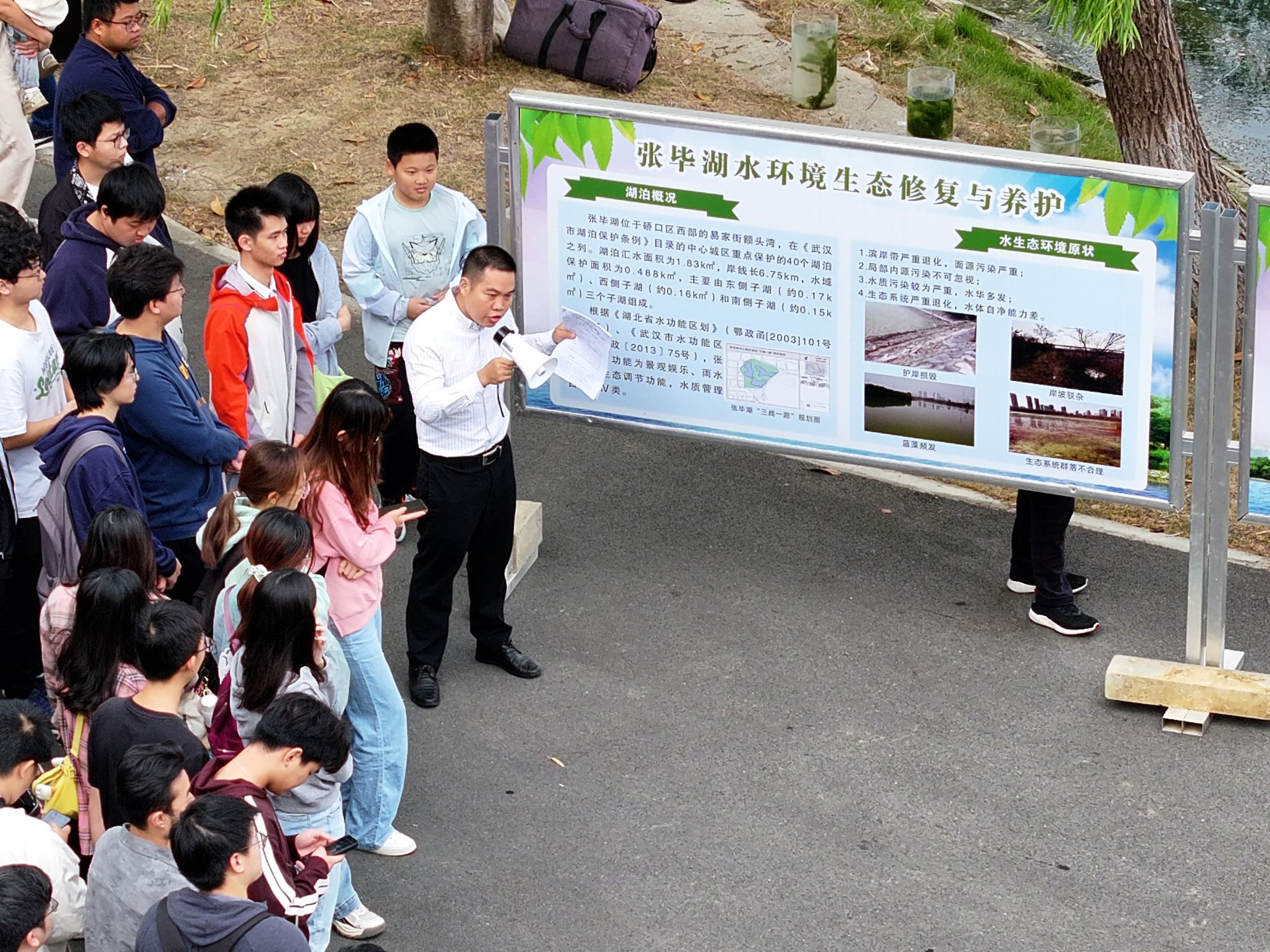 张毕湖公园作为武汉城市湖泊治理的成功案例之一,为水生态学课外实践开展提供了最佳条件。学院主管本科生教学工作的副院长严鹏教授赴现场指导教学工作。现场,硚口区湖泊管理所所长李晖为学生们详细介绍了张毕湖的治理历程、存在问题、解决措施、治理成效及未来管理规划等;湖北省水科院苗滕、张艺老师协助学生们开展湖泊水质采样与检测、底泥采样与分析、水生动物采样与分析等一系列实验。这些实践活动使学生们直接了解到城市水生态治理中的各种技术和管理手段,更好理解水生态治理的复杂性和挑战性。