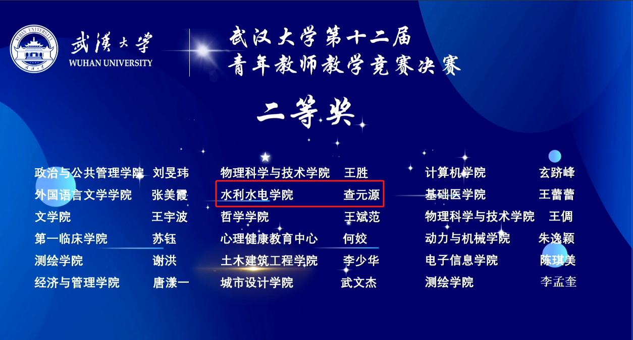 查元源老师提到,在参加青教赛的过程中,他深刻感受到高校教学的魅力与挑战。赛前,学院专门组织了院内外专家进行指导,发现很多以前忽略的问题,尤其槐文信老师传授了水利学科教学的一些独家秘笈,对于本次参赛和以后课堂教学都有极大帮助。他感悟,虽然教学竞赛和日常教学有些不同,但是竞赛为日常教学的持续性改进提供了一种高效方式,他也尽情享受了比赛过程。