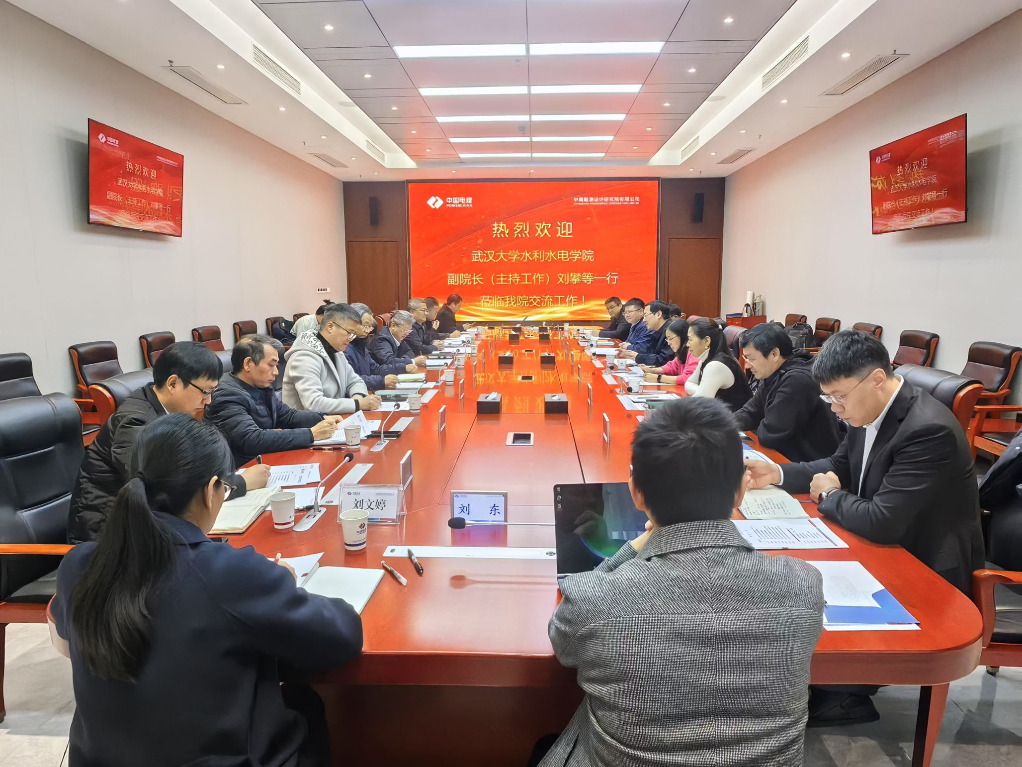 随后,刘攀一行来到中国电建集团中南勘测设计研究院有限公司进行走访调研。中南勘测设计研究院有限公司总经理、党委副书记程浩对学院一行的到来表示热烈欢迎,邀请大家一起观看了中南院宣传片。程浩感谢学院为中南院输送了大量的优质毕业生,中南院的高速发展离不开学院的关心和支持。刘攀感谢中南院对学院人才培养的认可和支持,并简要介绍了学院目前在学科布局、科研力量以及校企合作等方面基本情况。双方围绕专业学位硕博士研究生联合培养指导及其学位论文实施成果评价等方面开展了深入的沟通交流,并计划制定详细的实施方案,切实推动双方联合培养专业学位硕博士研究生。