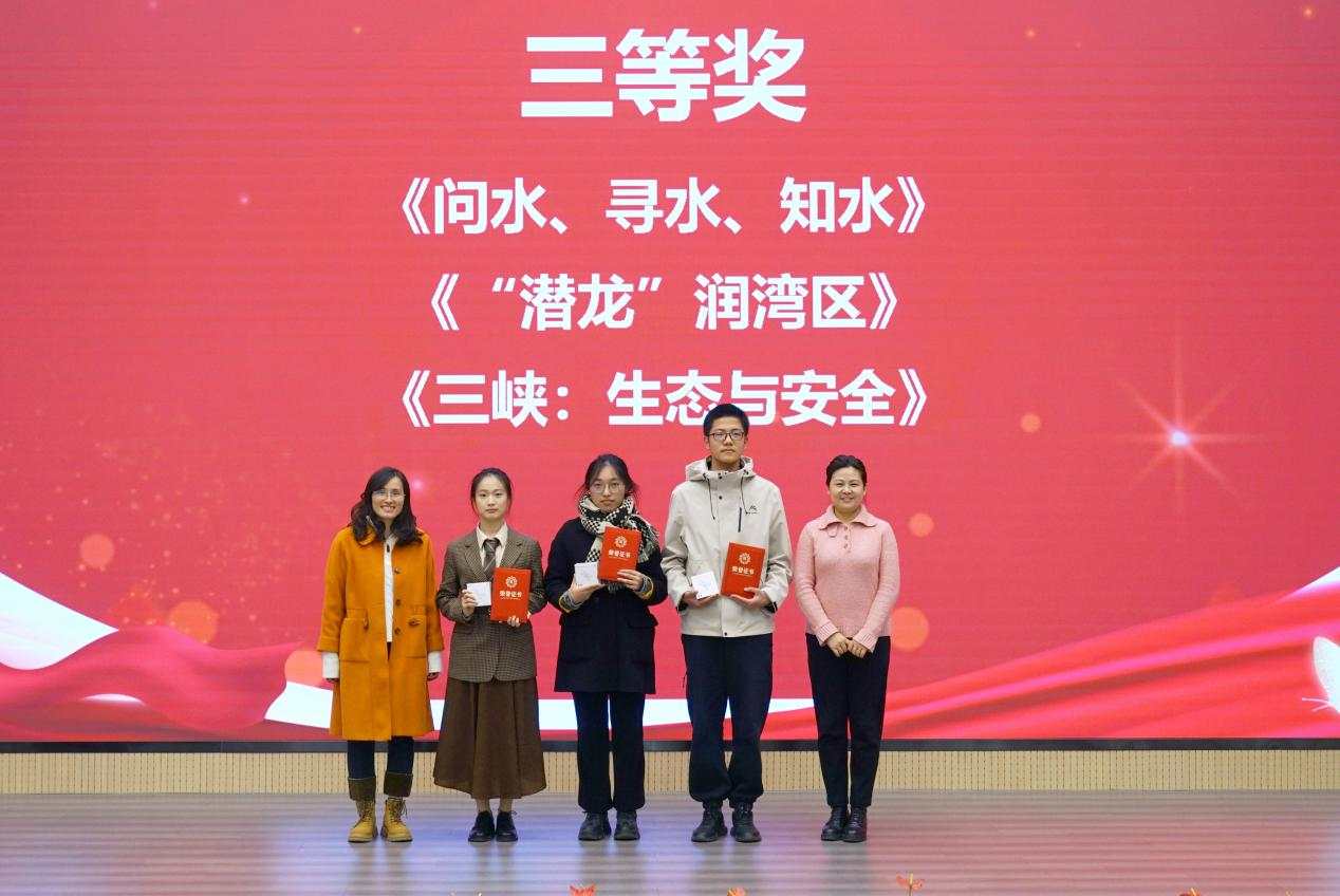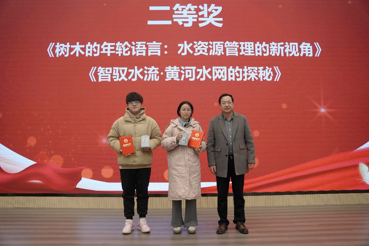 颁奖环节,获奖代表依次上台领奖,并在现场展播了他们的优秀作品,赢得了观众的阵阵掌声。其中,一等奖作品《为了长成参天大树,树木喝水需要多努力?》以树木的喝水和蒸腾为主题,不仅揭示了树木与水的紧密关系,还传递了生态保护和水资源可持续利用的重要性,以其独特的视角和精湛的制作获得了全场瞩目。二等奖作品《树木的年轮语言:水资源管理的新视角》以树木年轮为切入点,通过生动的案例和详实的数据,向公众普及了树木年轮在水资源管理中的应用;《智驭水流·黄河水网的探秘》以黄河水网为主题,通过历史的回望和科技的展现,描绘了水利事业的辉煌成就和智慧水利的崭新篇章。三等奖作品《问水、寻水、知水》《潜龙润湾区》《三峡:生态与安全》及优秀奖作品《青年先锋齐挺膺,流域生态焕新颜》《智慧赋能水安全,数窥江河守安澜》《长江百年变迁:从生态保护到智能治理》等也各具特色,充分展示了武大师生在水科普微视频创作方面的创新能力。