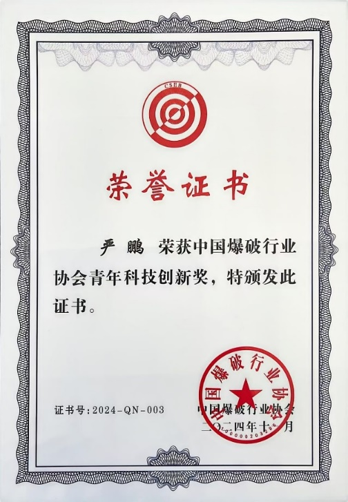 严鹏教授还荣获首届中国爆破行业协会青年科技创新奖。中国爆破行业协会科学技术奖”于2001年设立,2003年经科学技术部、国家科学技术奖励工作办公室批准登记。中国爆破行业协会“青年科技创新奖”是“中国爆破行业协会科学技术奖”的子奖项,从2024年起每3年评选一次,授予年龄不超过45周岁、且在科学技术研究中取得重要成果,产生一定的学术影响,一定程度上推动了行业科技进步和相关学科发展的青年科技工作者。