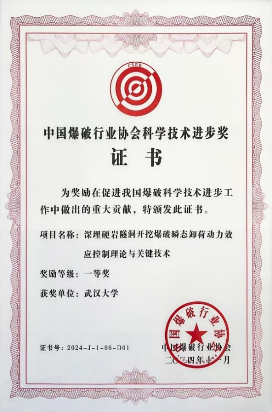 为第一完成单位的《深埋硬岩隧洞开挖爆破瞬态卸荷动力效应控制理论与关键技术》荣获2024年中国爆破行业协会科学技术进步一等奖。