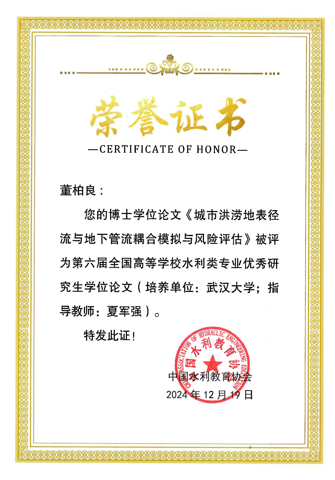 经中国水利教育协会组织评选,学院2020级博士生董柏良荣获第六届全国高等学校水利类专业优秀研究生学位论文,此次遴选的优秀博士学位论文共10篇。