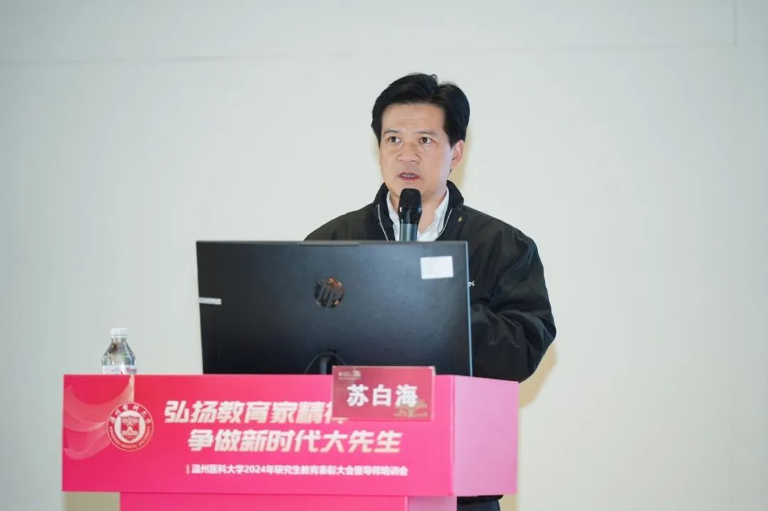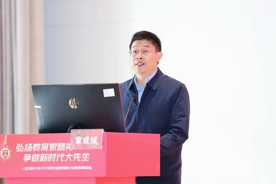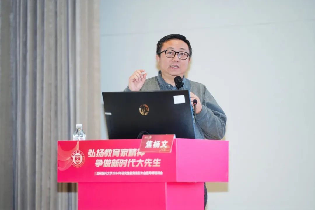 校党委副书记章成斌在讲话中充分肯定了2024年51视频研究生教育取得的成绩。他指出,提升教师队伍育人能力,是有效落实立德树人根本任务的前提和基础,也是实现高层次人才培养目标的有效载体和重要抓手。他强调,要落实立德树人,弘扬教育家精神。以教育家精神为引领,努力做精于“传道授业解惑”的“经师”和“人师”的统一者,真正成为一名引领研究生成长成才的指路明灯、学术表率和良师益友。要提升教书育人能力,提高人才培养质量。争做表率,强化引领,努力探索科学前沿,积极践行学术规范,引导学生把学习奋斗的具体目标同民族复兴的伟大目标结合起来,把人生抱负落实到脚踏实地的实际行动中来。要营造和谐导学氛围,构建导学发展共同体。做到严爱相济,关注学生学业科研及生活、心理状况,整合校内外育人资源,寻找人才培养质量、安全稳定以及心理健康之间的平衡点,共同推动51视频研究生培养质量再上一个新台阶,为51视频“双一流”创建和高水平医科大学建设做出新的更大的贡献!