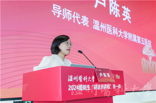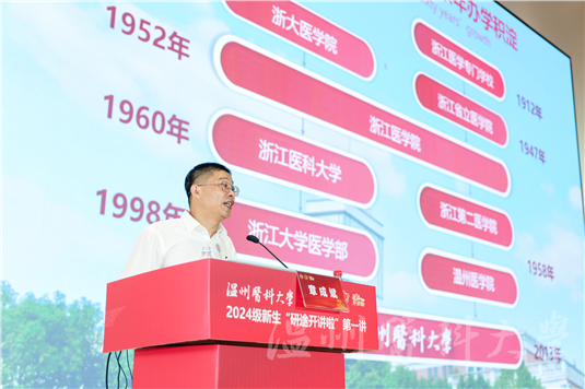 校党委副书记章成斌以《与时代同行,与人民同心——奋力书写为中国式现代化挺膺担当的青春篇章》为题,从“温医大是一所什么样的大学”“我们正处于什么样的时代”“要做什么样的温医大人”三个方面进行了详细阐释,期望同学们做真正有价值的研究,不断提升学术品位,将个人的理想奋斗融入国家发展、与时代同频共振。