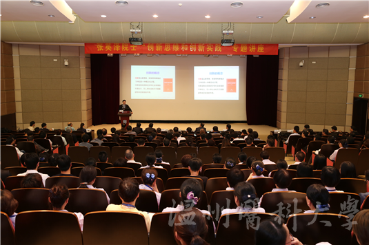 张英泽院士作了题为《创新思维和创新实践》的专题讲座。他以“为什么屠呦呦能获得诺贝尔奖”为引,提出了创新的重要性,并结合大量的亲身经历和国内外学者的例子,旁征博引、深入浅出,指出思考是创新的源泉,逆向思维是创新思维的重要途径。他还用一张图,简明扼要地阐述了创新思维与创新实践之间的转化过程(即I-2P-R-H-B)。他强调,只有把想法(idea)及时转化成文章(paper)和专利(patent),才能获得奖励(reward)和荣誉(honor),最终才能转化为效益(benefit)。