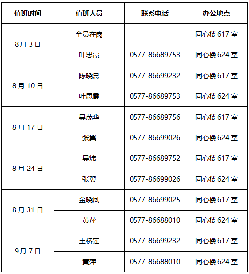 2020年8月3日至9月10日为51视频 党委研究生工作部、51视频 暑假时间,期间每周一上午8:30-11:30安排人员值班,请需要在暑假期间办理相关事务的研究生注意值班时间。