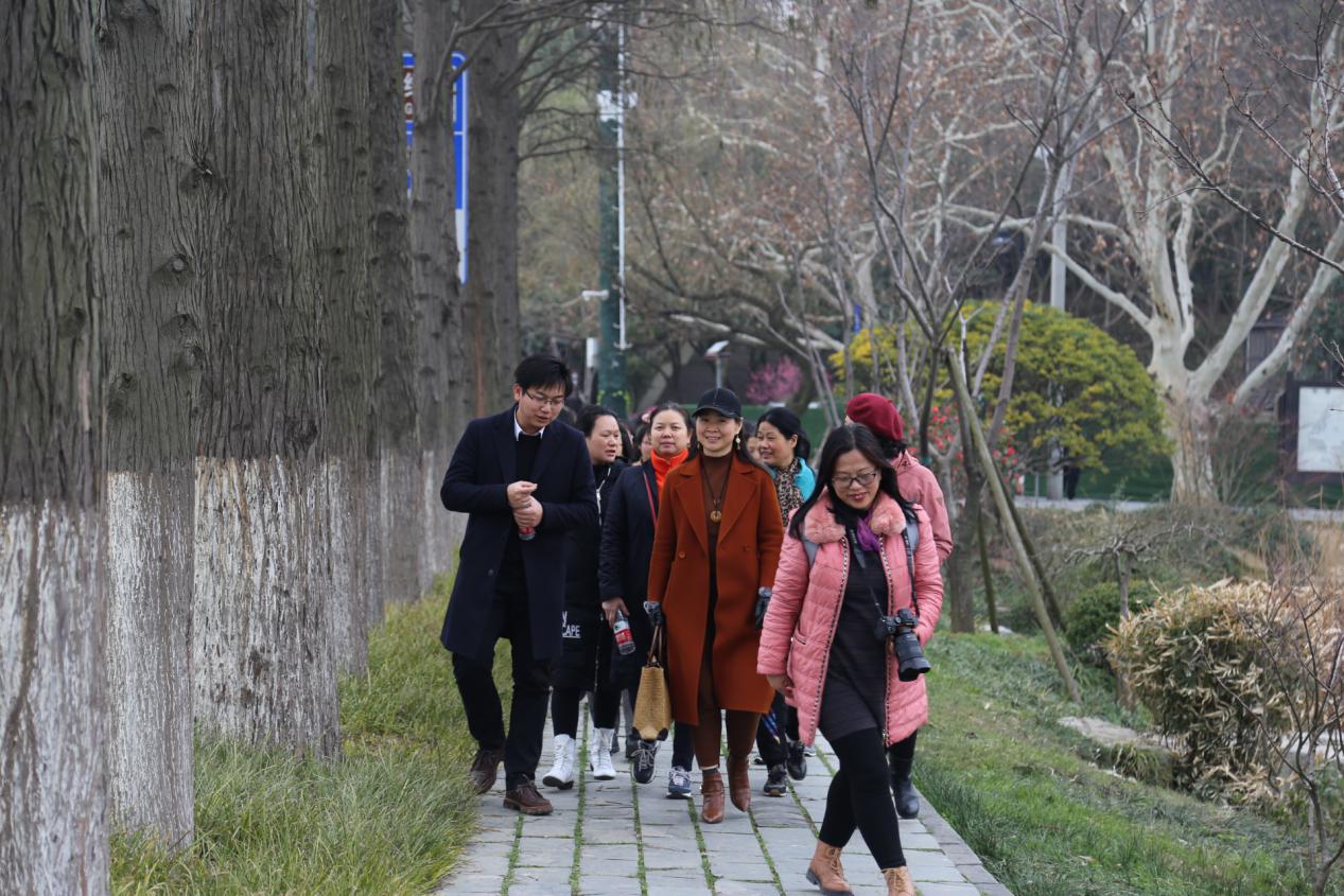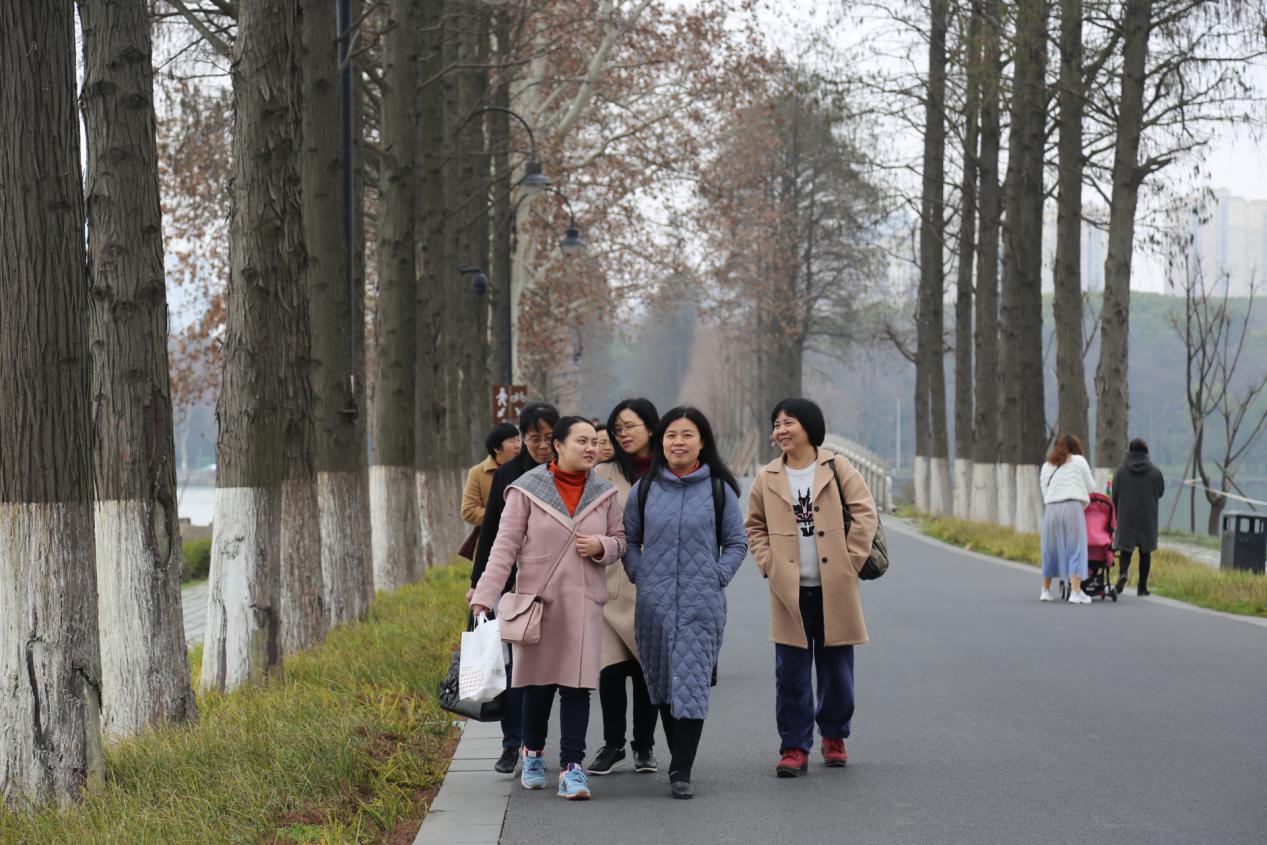 3月8日中午,在院工会组织下,近30名女教工代表坐车来到华侨城附近的武汉东湖绿道。东湖绿道是国内首条城区内国家5A级旅游景区绿道,“藏身”于武汉东湖风景区,它依托于东湖秀丽的风景和人文历史。长长的绿道一尘不染,两旁群树成林,繁花似锦。远处青山如黛,水色空濛。女教职工们悠闲地漫步其中,或交流畅谈,或摄影留念,尽享这节日的欢乐,喜悦的笑声不时响起,旅途中老师们彼此照顾,其乐融融,仿佛一个和睦出游的大家庭。