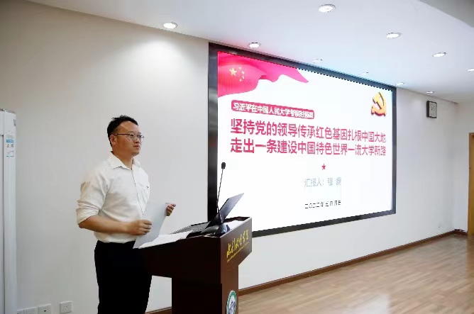 首先,青年教师代表水文水资源系程磊教授领学习近平总书记在中国人民大学考察时的重要讲话。他在学习中谈到,要争做为学、为事、为人示范的大先生,要充分发挥课程思政的立德树人作用、讲好中国水利水电故事,要以回答“四问”为学术己任。