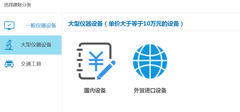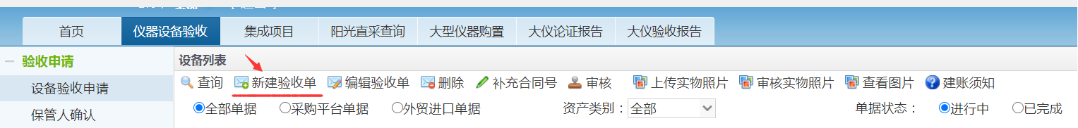 ,配置管理,在“仪器设备验收”模块,新建验收申请单,选择对应类型。