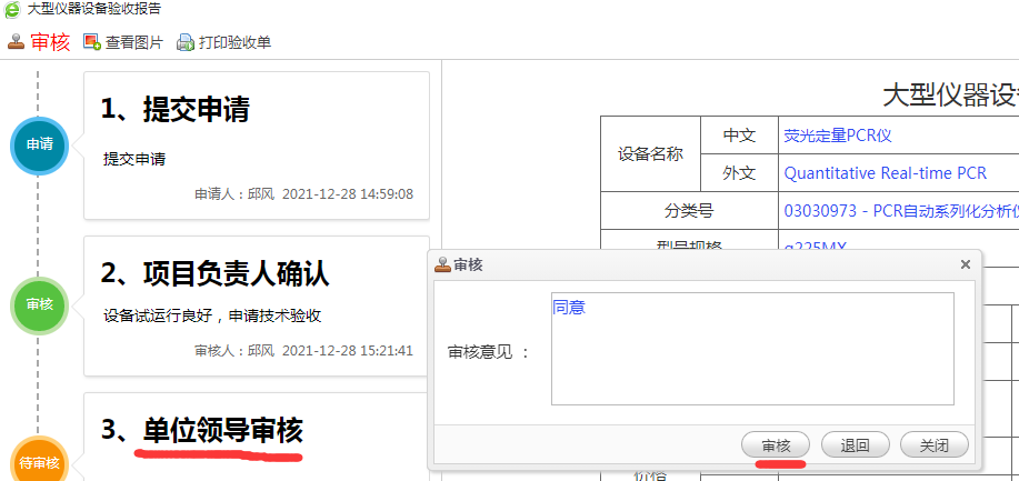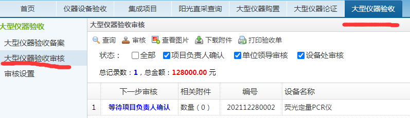 4、单位领导登录设备管理信息系统,在“大仪验收报告”模块,选择大型仪器论验收审核,双击待审核设备,进行审核。