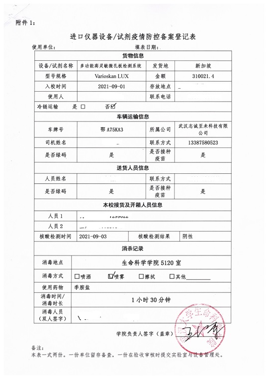 进口仪器设备/试剂疫情防控备案登记表: