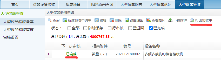 5、设备处完成审核后,选择已完成,可以看到已完成的设备。选择打印验收报告—可打印验收报告。