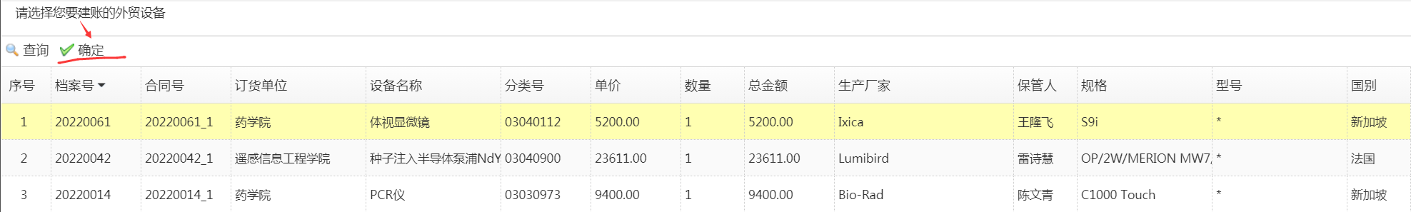 2、如是外贸进口设备需选中对应进口信息确定后,按要求填写待验收设备相关其他信息。